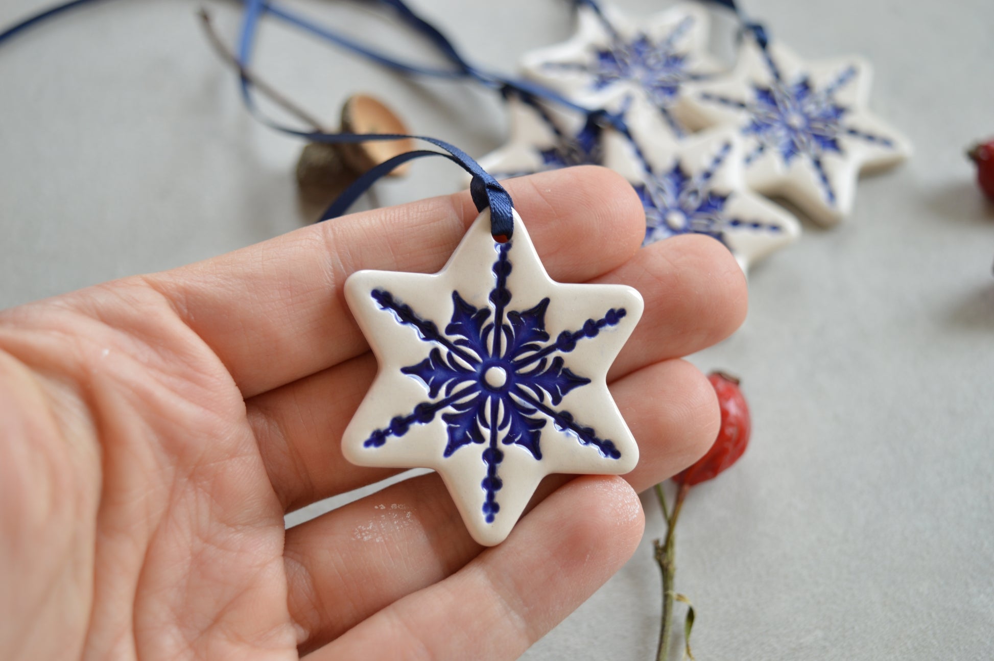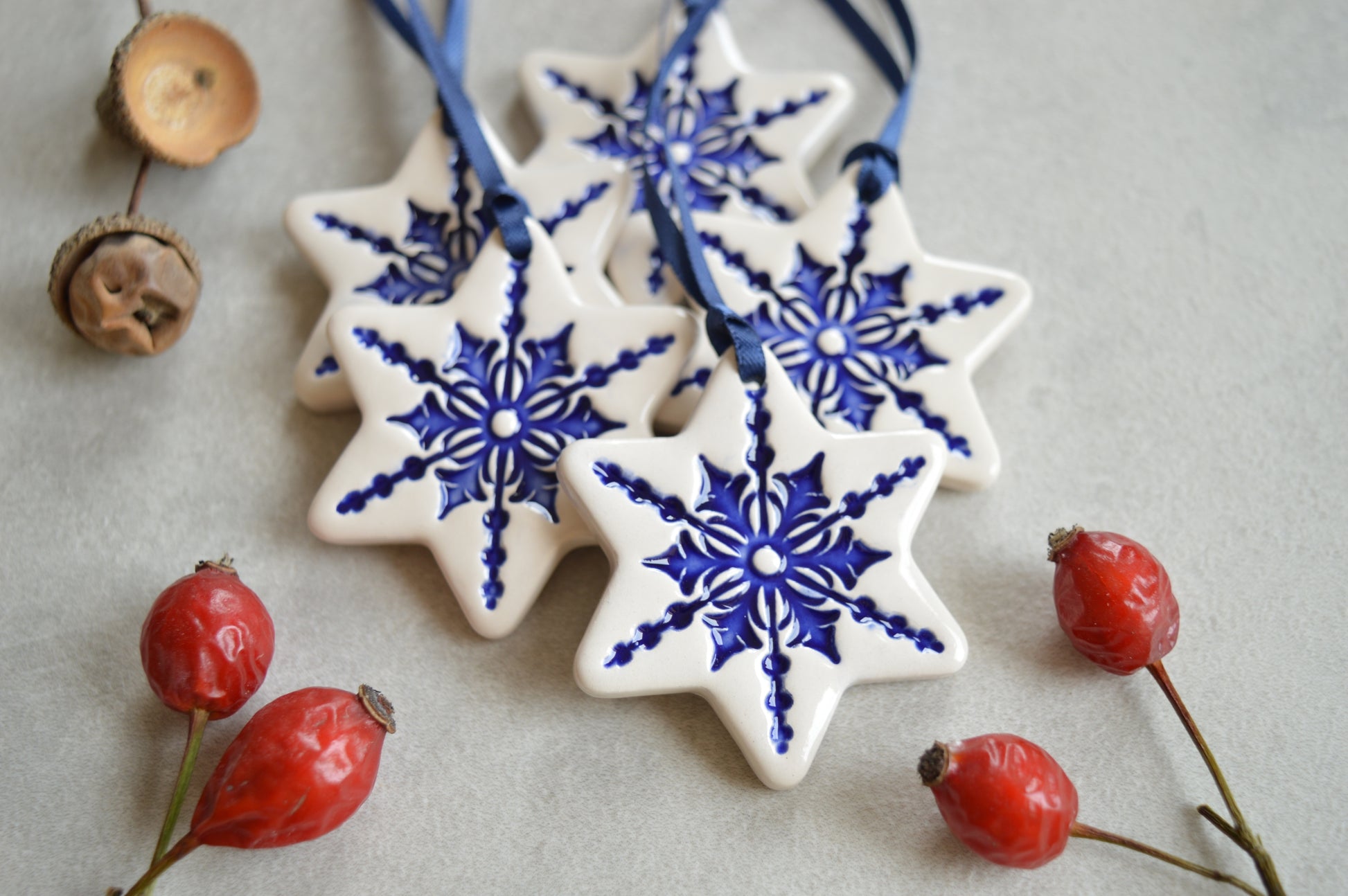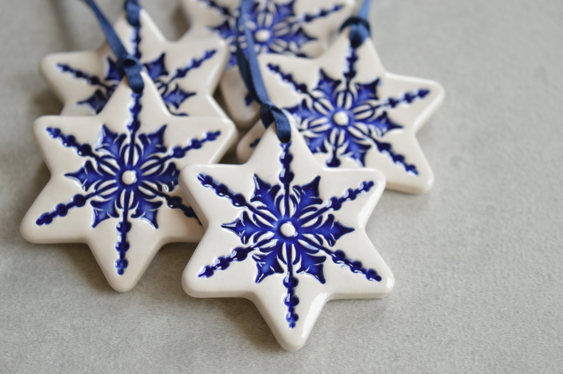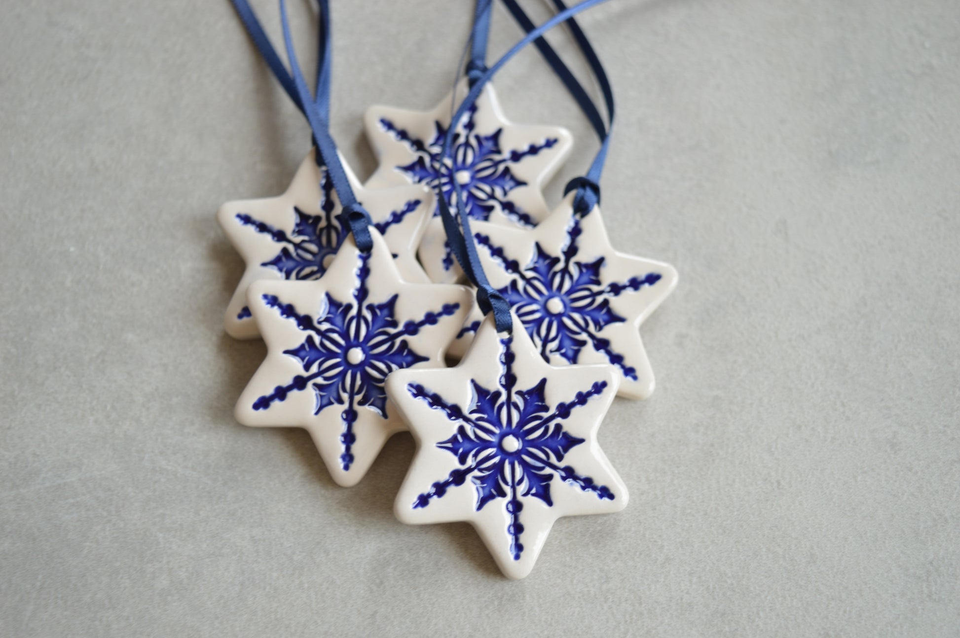 A set of 5 beautiful white ceramic star ornaments made of white earthenware clay and fired twice around 1000°C. First the snowflake impression was inlaid with royal blue underglaze and then the ornament was coated with transparent glaze. The backside where the ornament was touching the kiln was left unglazed. The ornaments come with navy blue satin ribbons.