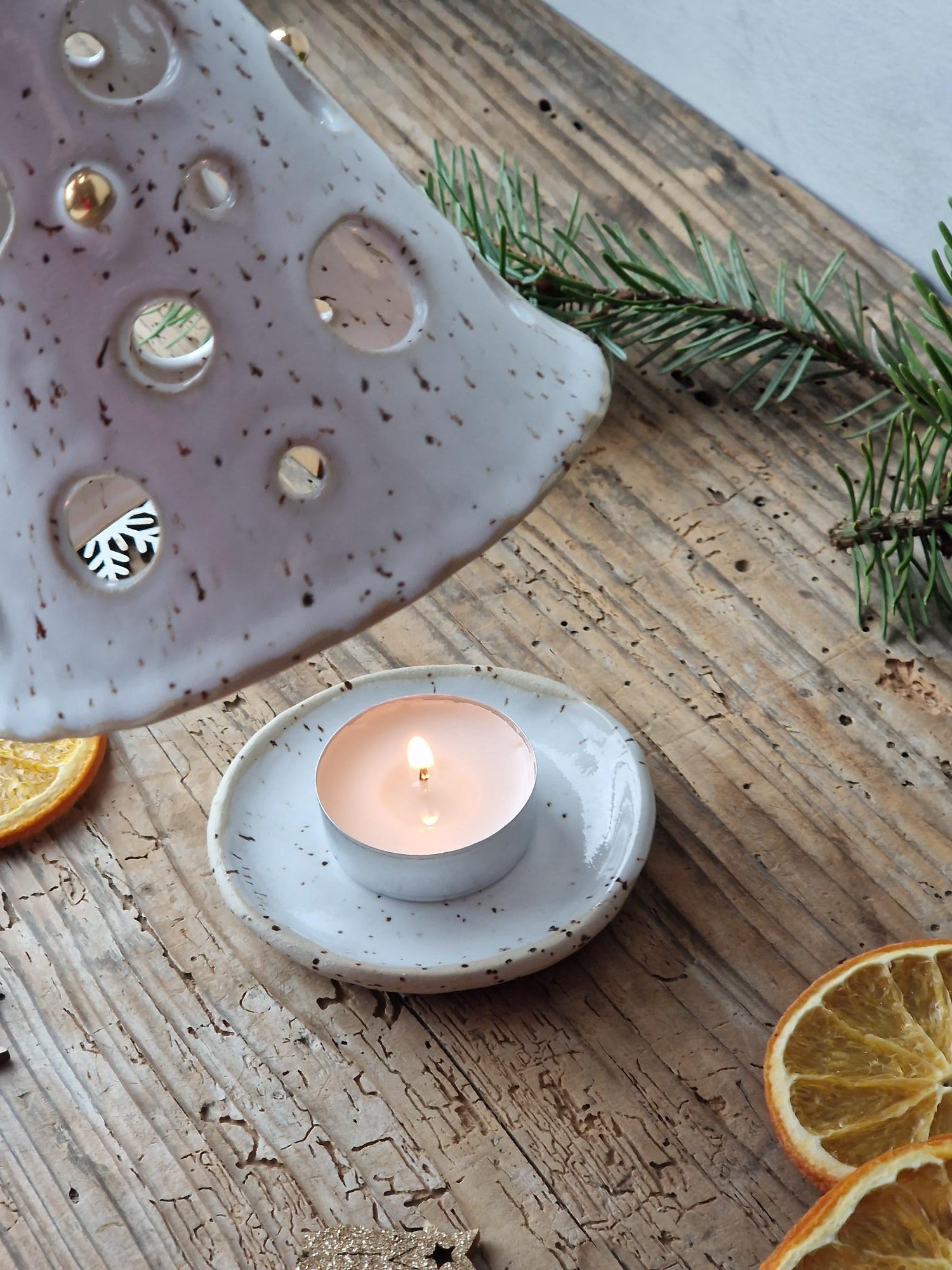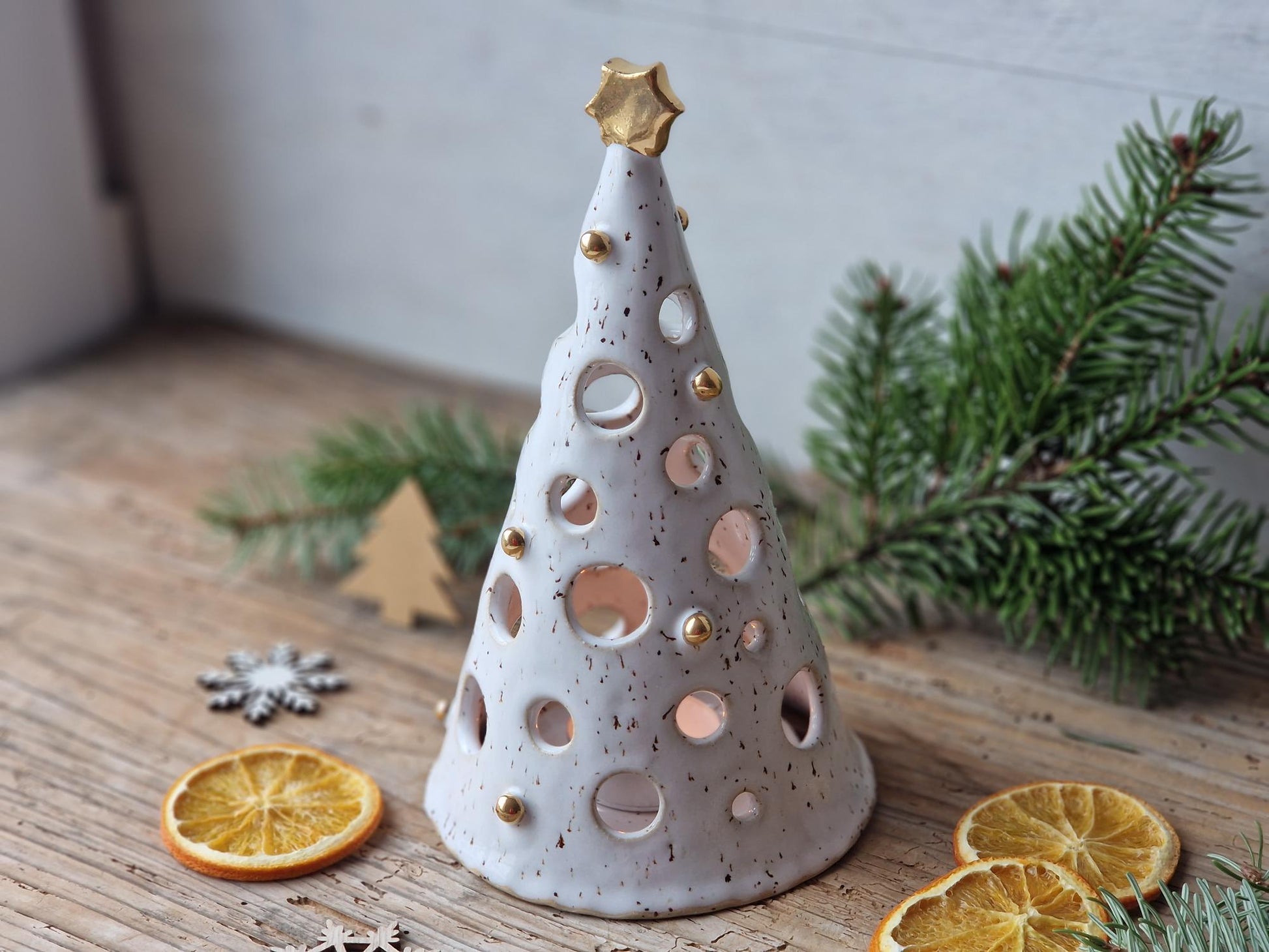 This handmade ceramic Christmas tree candle holder with gold pearls is going to make your room feel very festive!