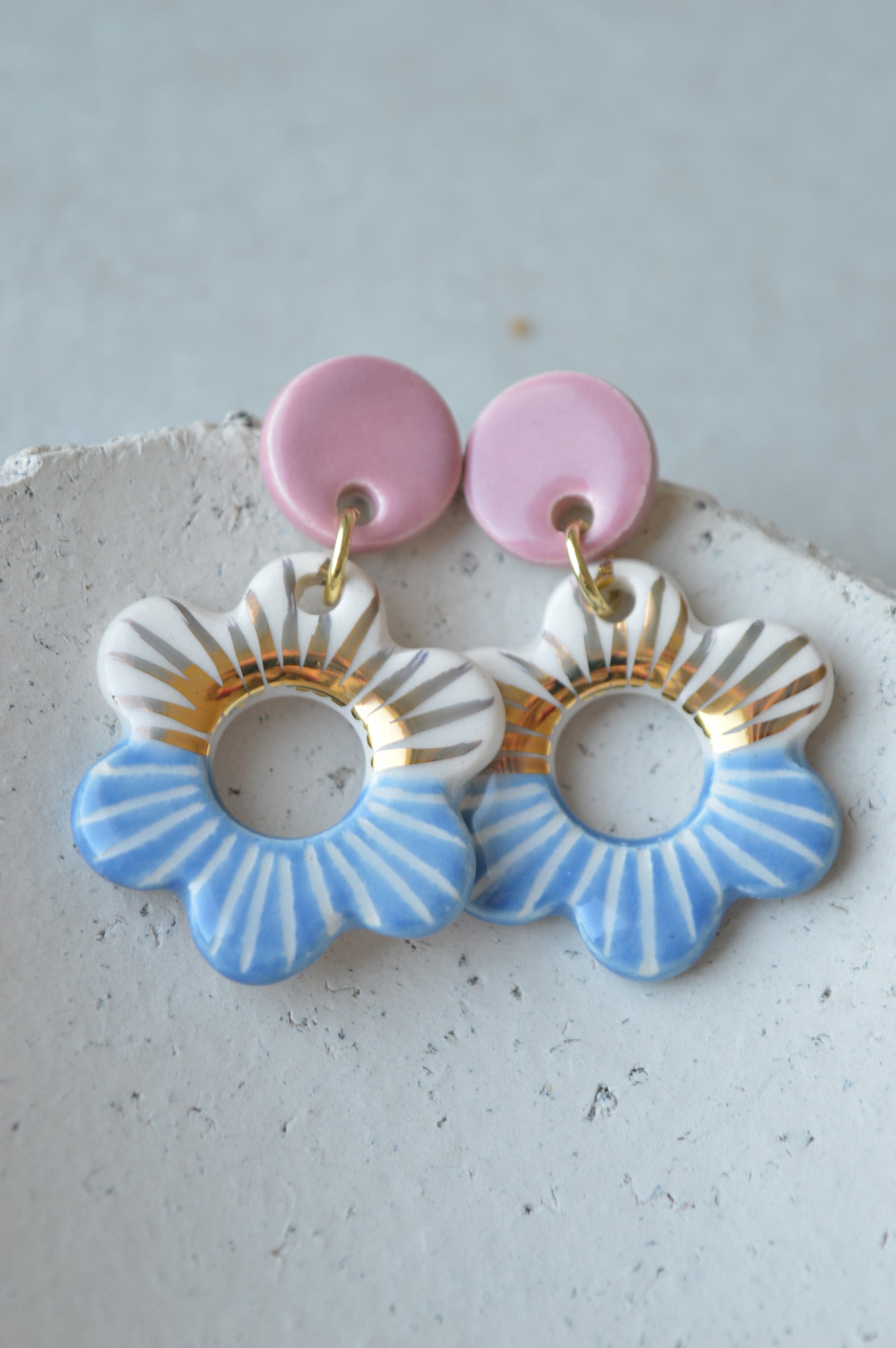 A pair of handmade ceramic flower earrings in blue and pink with carved pattern and decorated with real gold lustre. Lovely organic shape and light as a feather!