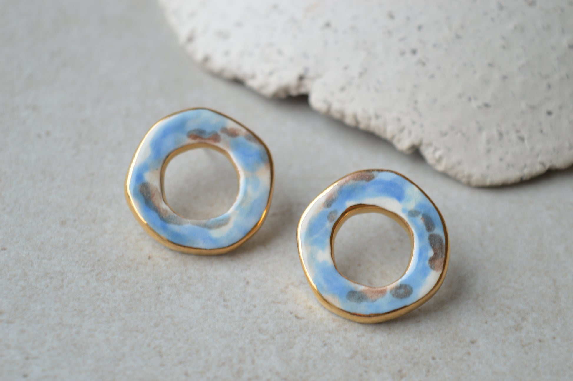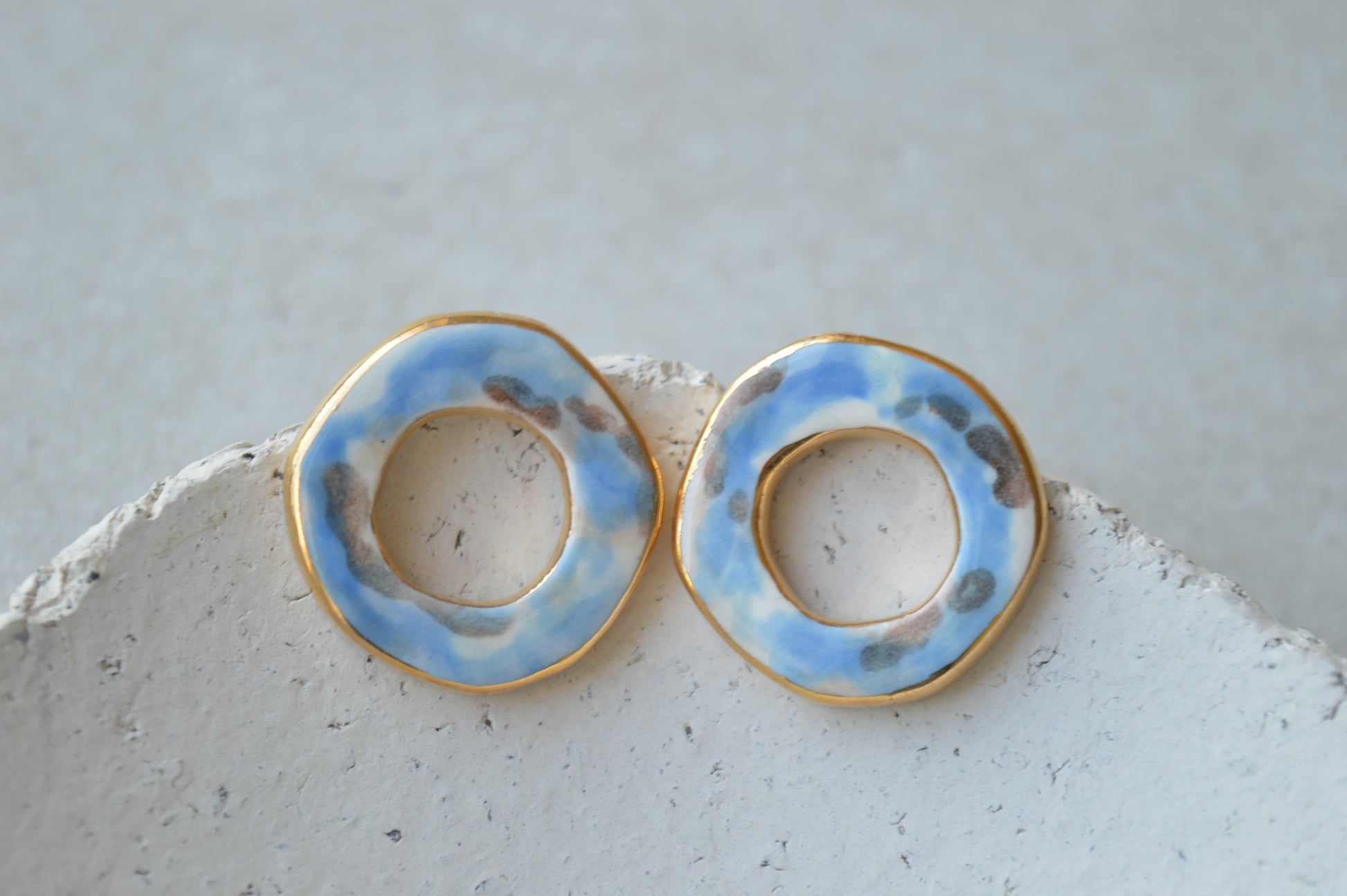 A pair of handmade cut-out ceramic stud earrings glazed in watercolour technique, and gold.