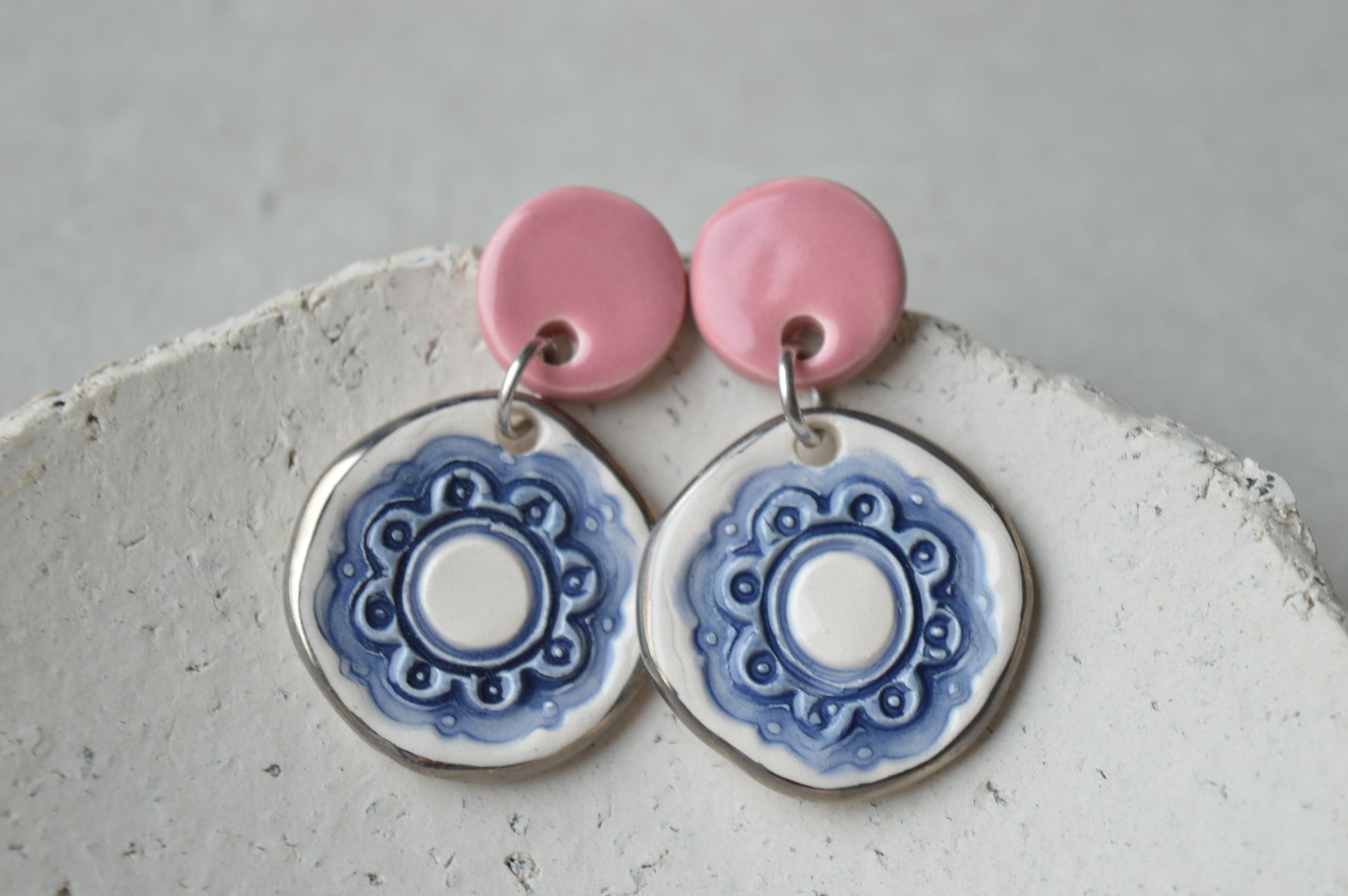 A pair of handmade ceramic drop earrings with impressed pattern, painted with watercolour technique, and platinum lustre rim. Modern organic shape. Comfortable and lightweight to wear.