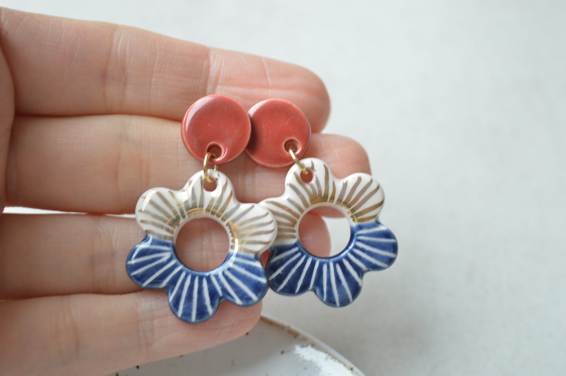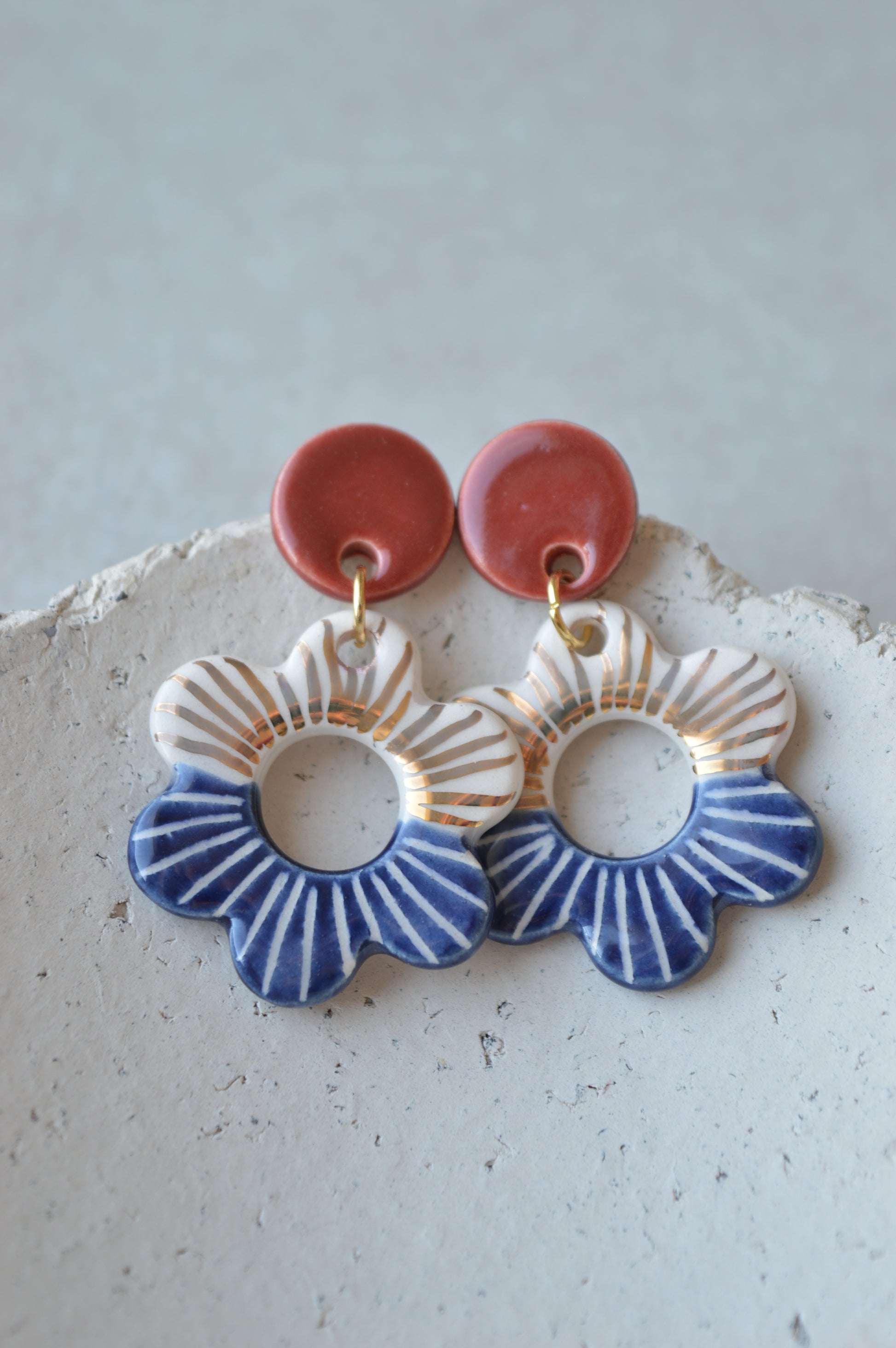 A pair of handmade ceramic flower earrings in dark blue and red with carved pattern and decorated with real gold lustre. Lovely organic shape and light as a feather!