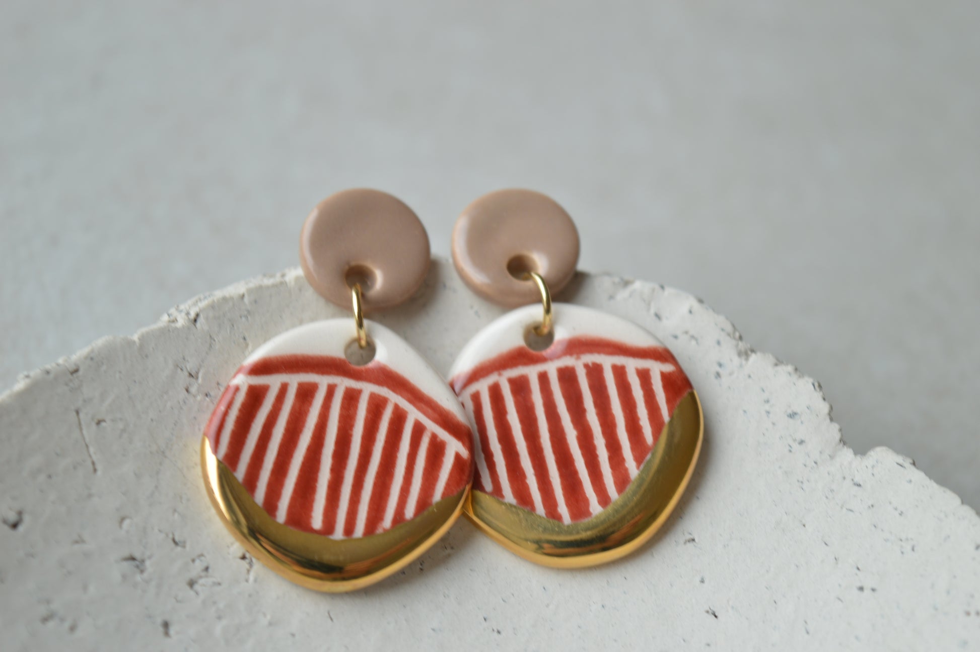 A pair of handmade ceramic drop earrings in pastel brown and cinnamon red, decorated with sgraffito technique, and dipped in real gold lustre. Modern organic shape. Comfortable and lightweight to wear.