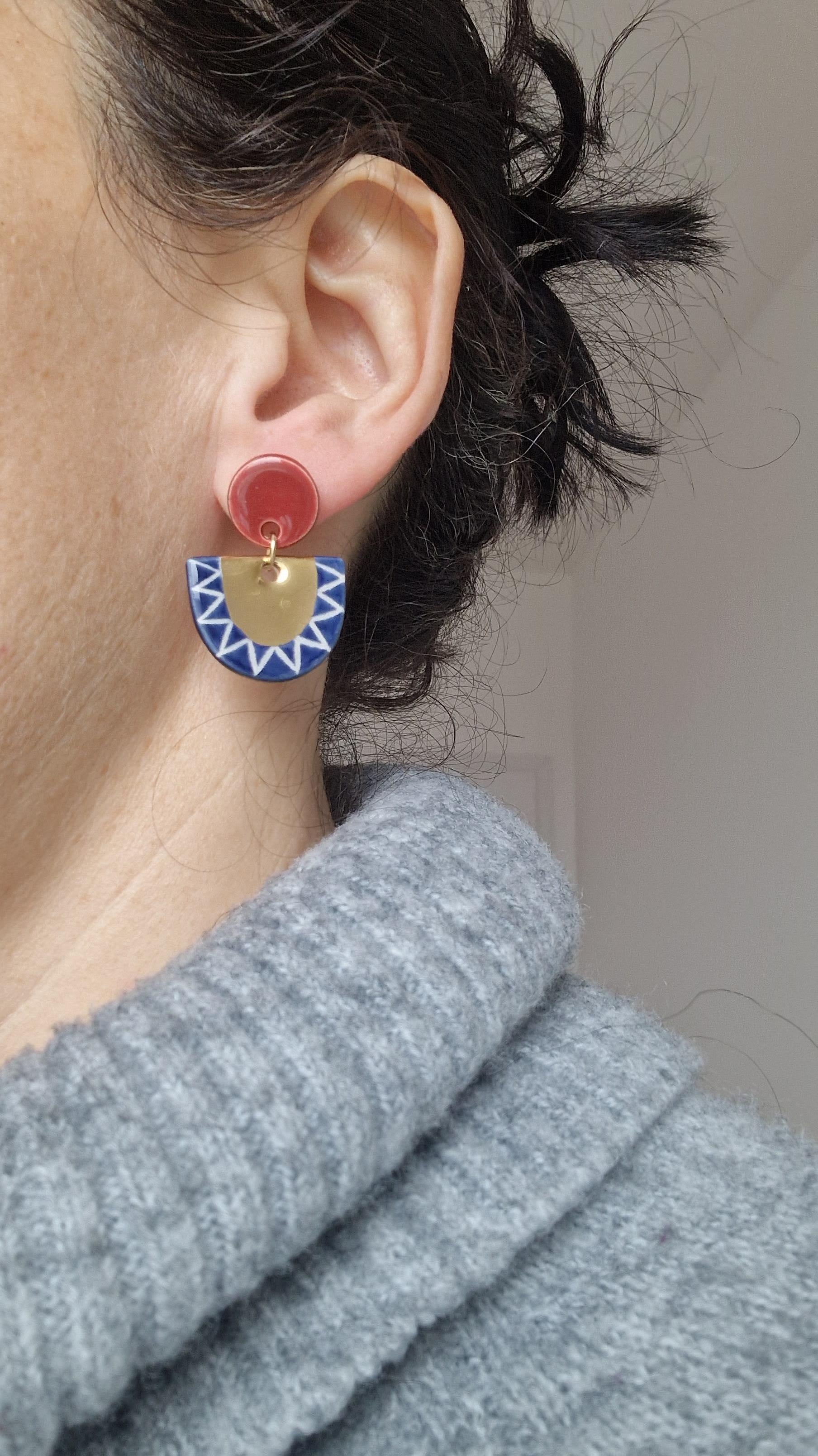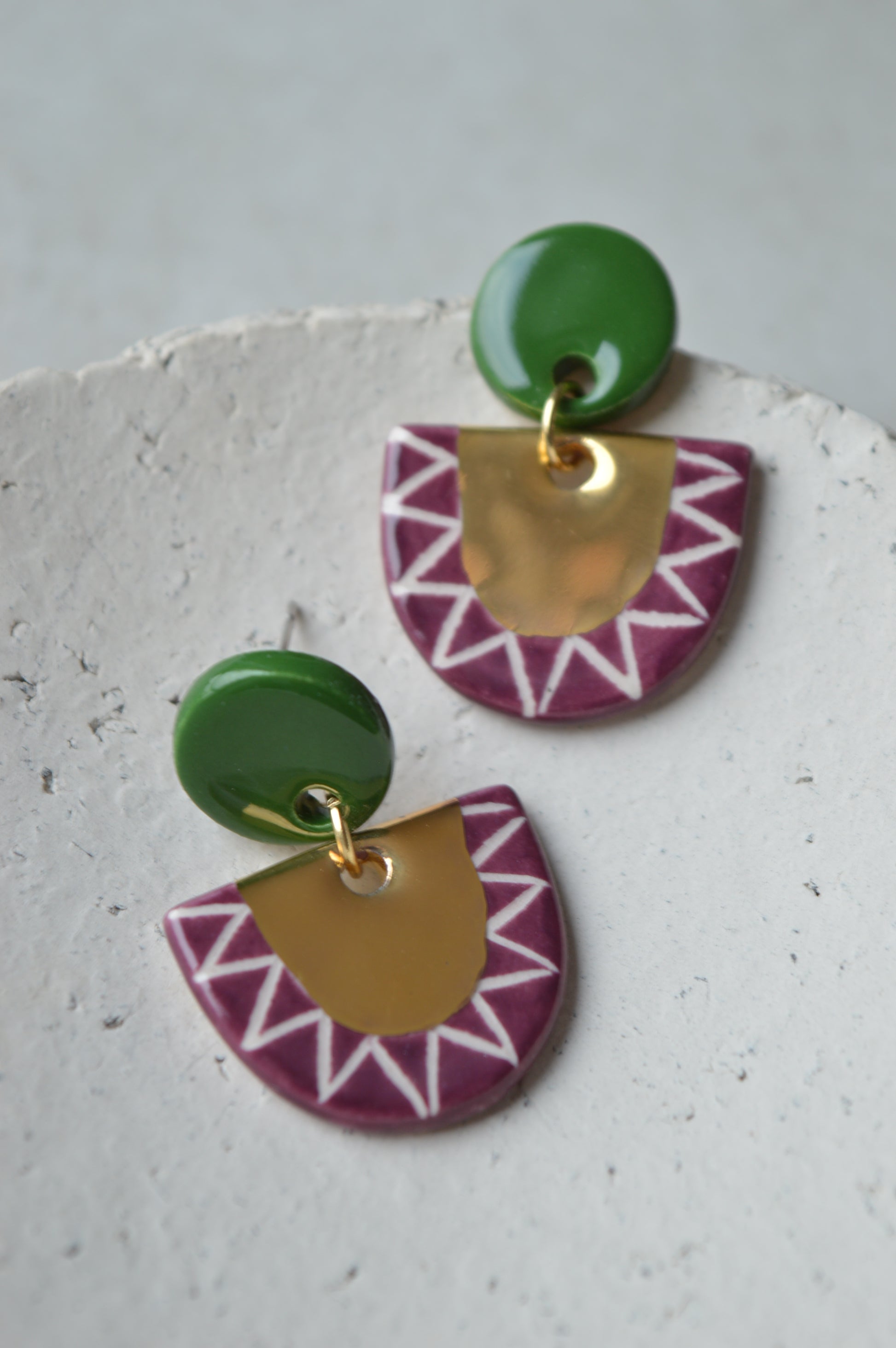 A pair of halfcircle ceramic drop earrings in purple and green, decorated with sgraffito technique, and dipped in real gold lustre. Modern organic shape. Comfortable and lightweight to wear.