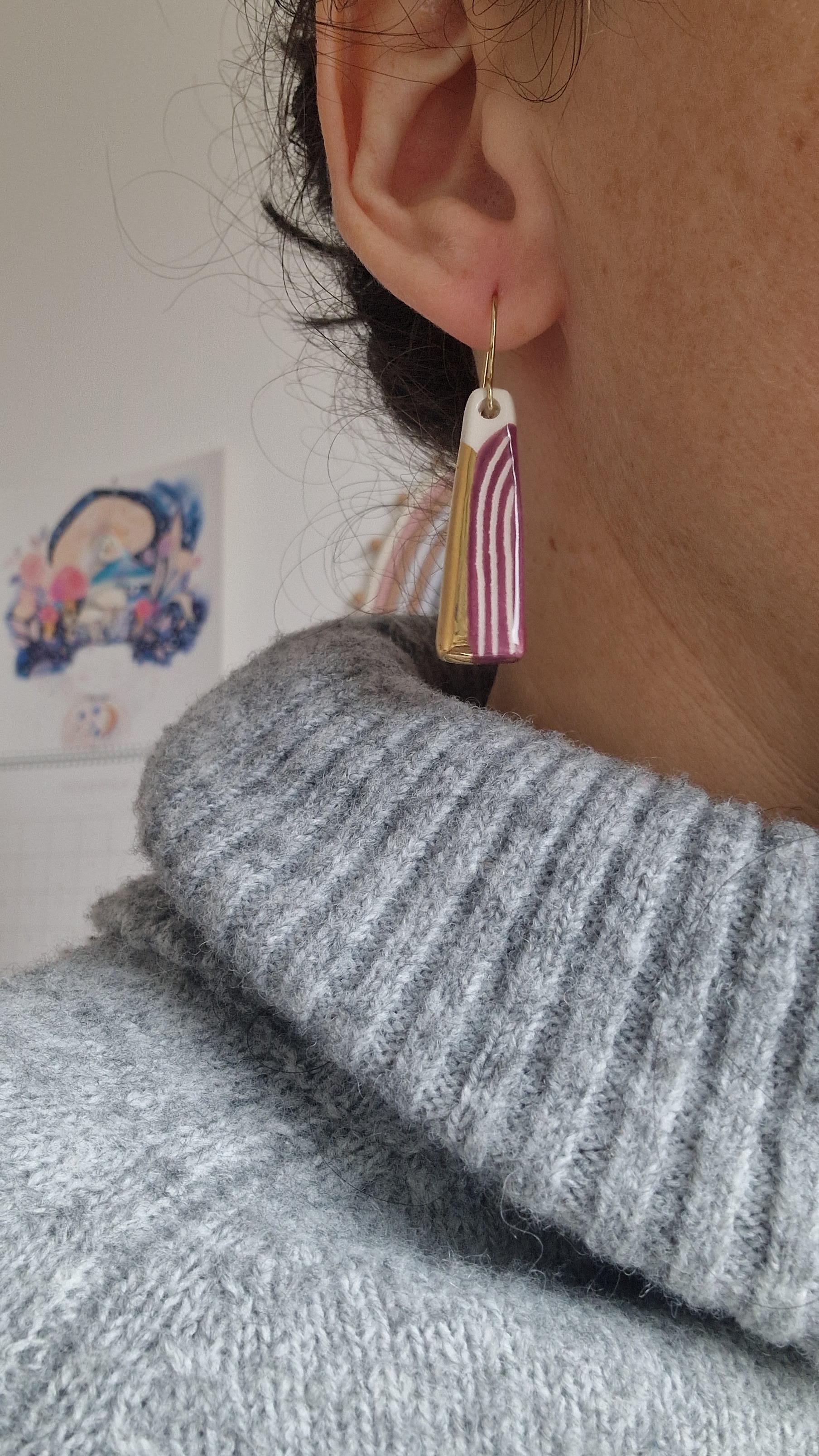 A pair of long ceramic drop earrings in purple, white and gold, decorated in sgraffito technique. Comfortable and lightweight to wear.