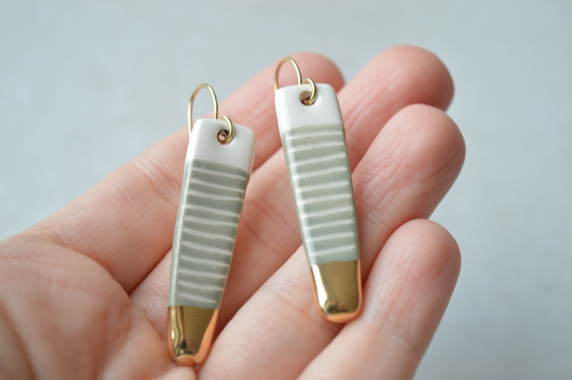 A pair of long ceramic drop earrings in grey, white and gold, decorated in sgraffito technique. Comfortable and lightweight to wear.