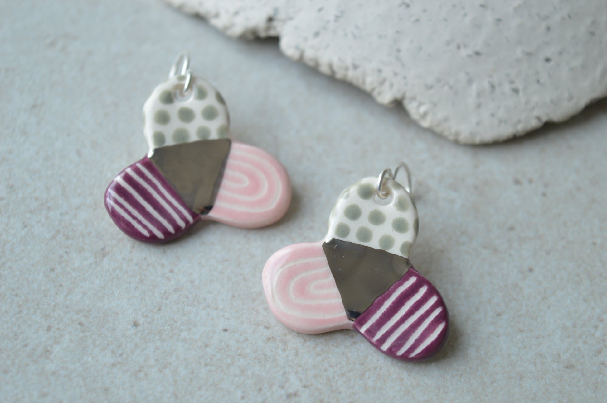 A fun pair of handmade ceramic leaf-clover earrings in purple, pink, and gray decorated with platinum lustre.