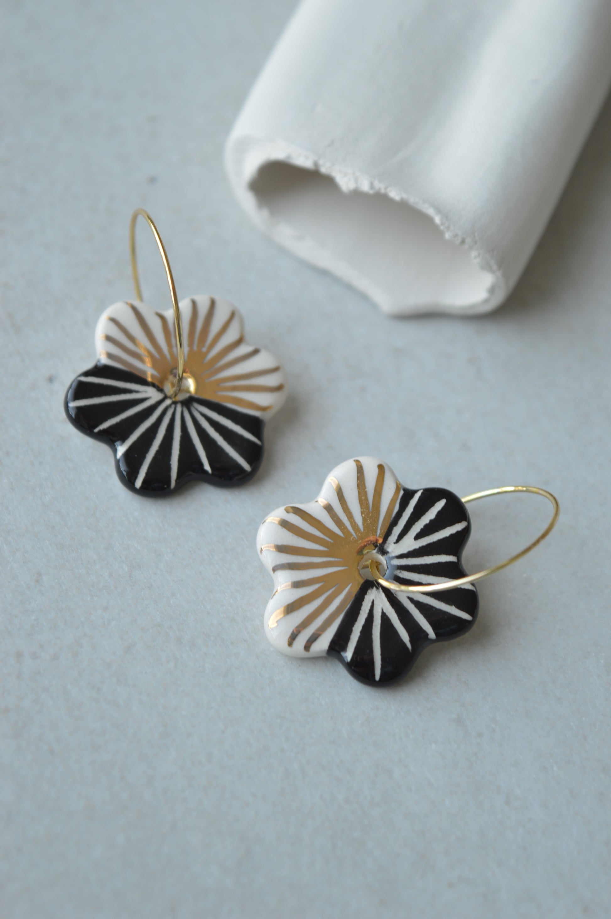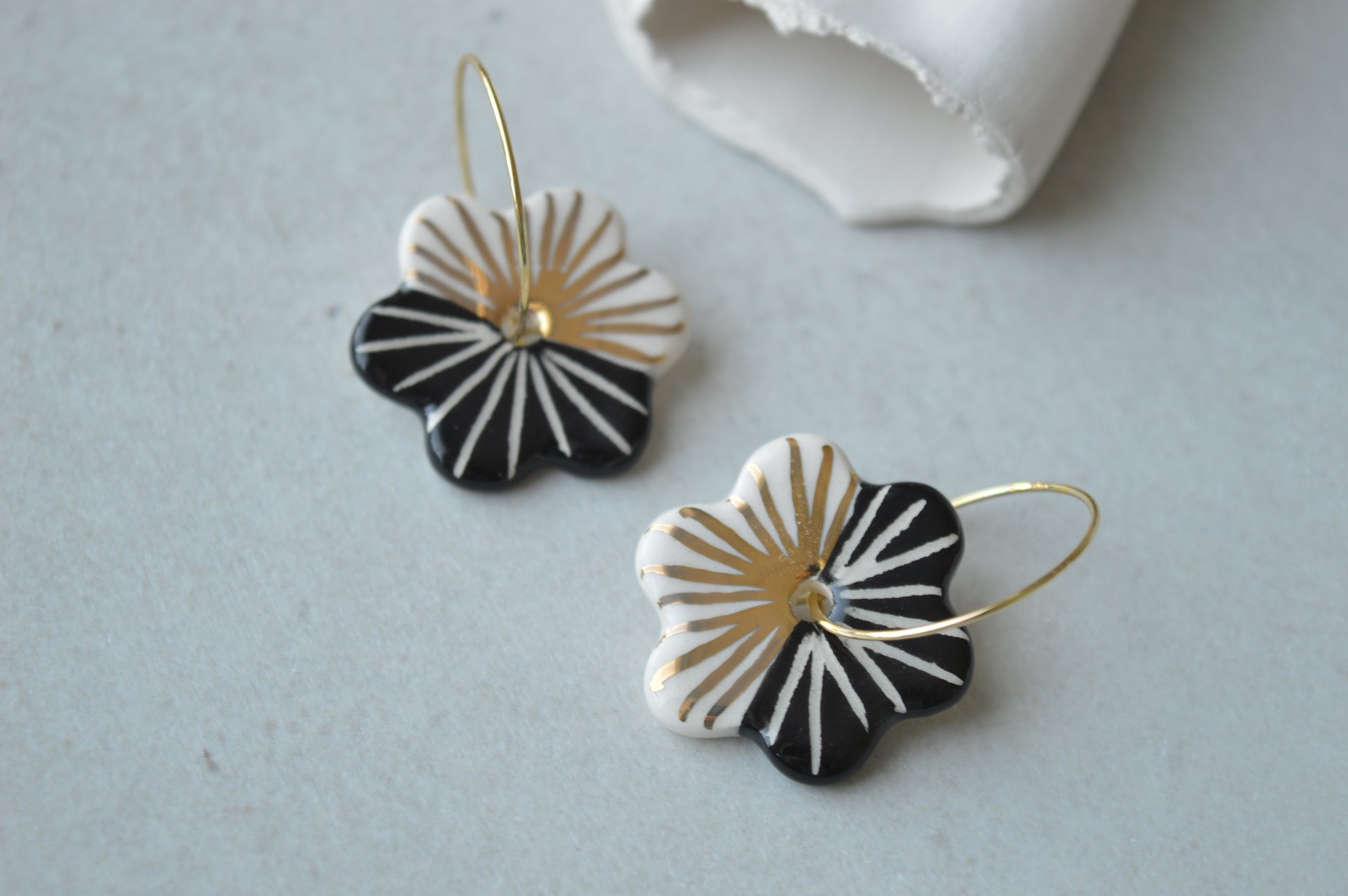 A pair of handmade ceramic flower hoop earrings in light and black, decorated with gold lustre. Modern organic shape. Comfortable and lightweight to wear.