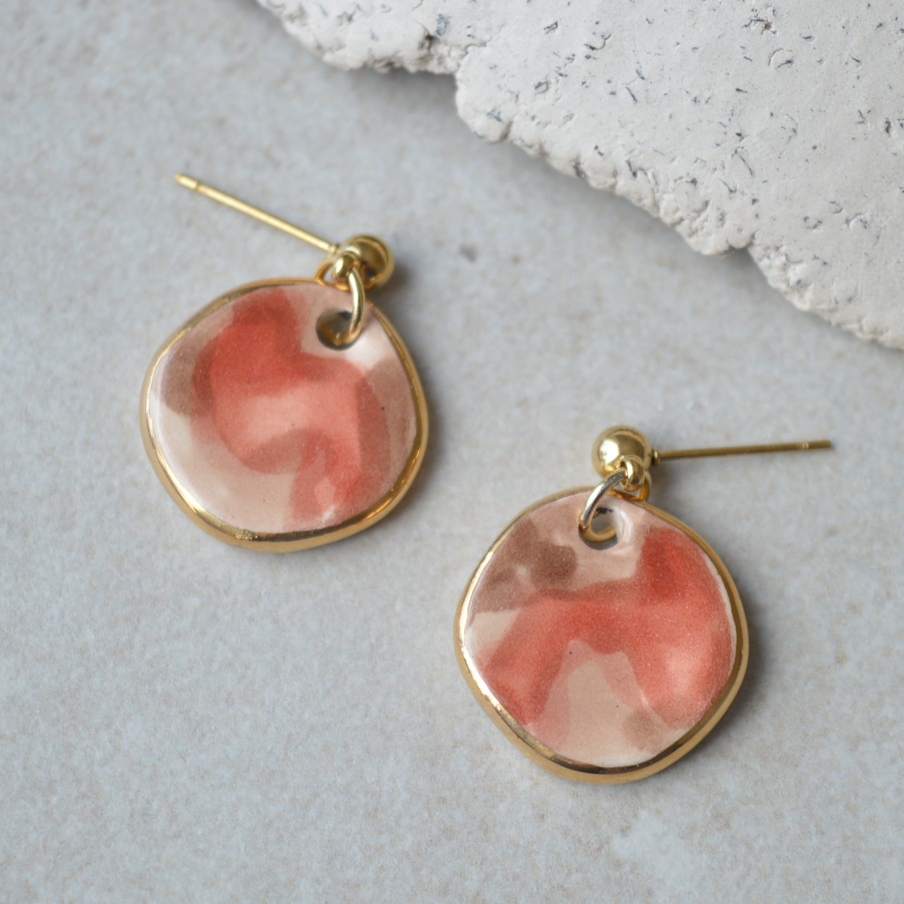 A pair of elegant handmade ceramic drop earrings painted in watercolour technique and embellished with gold. Comfortable and lightweight to wear.