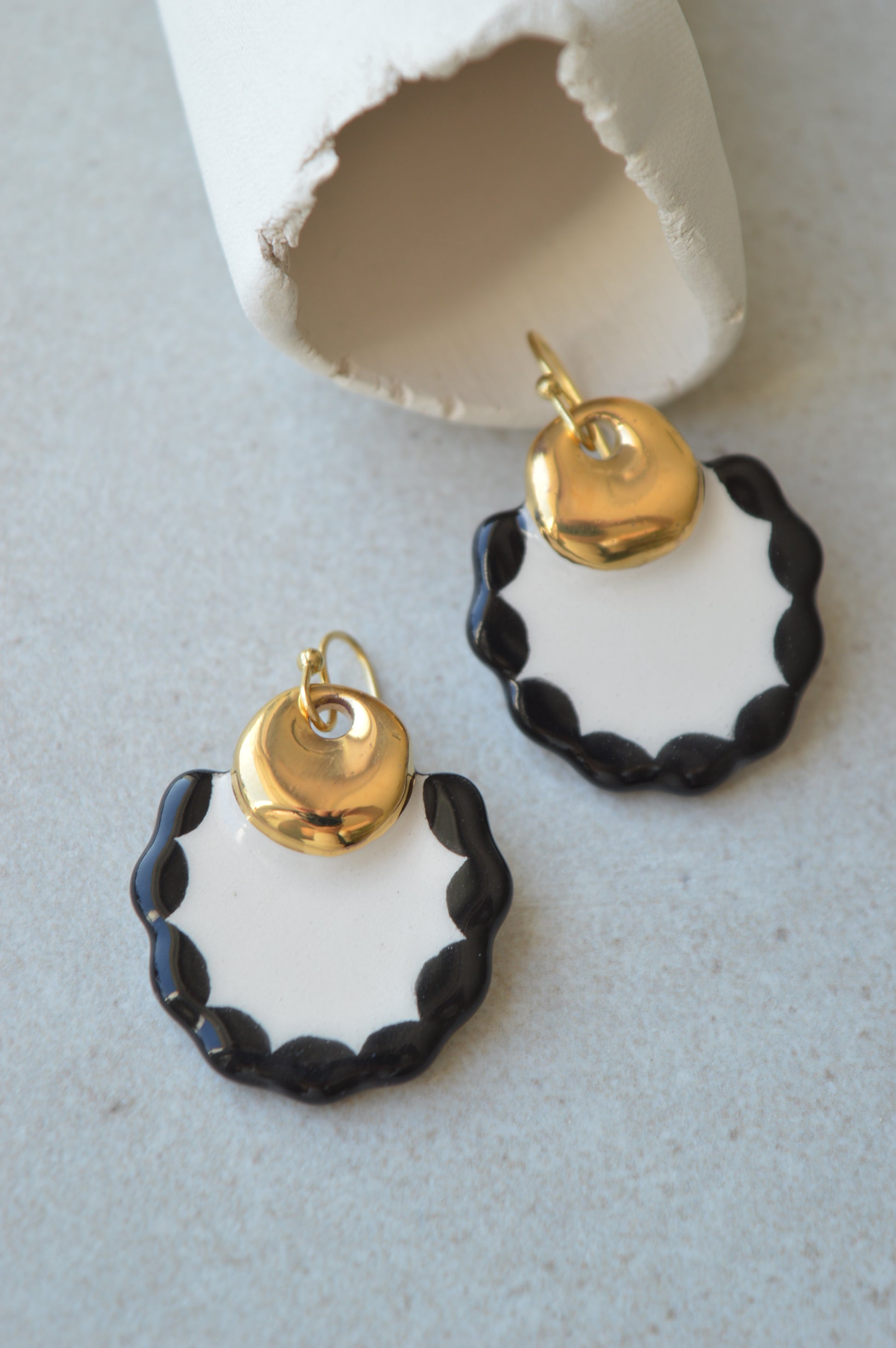 A pair of handmade ceramic drop earrings in black and white with gold lustre. Modern organic shape. Comfortable and lightweight to wear.