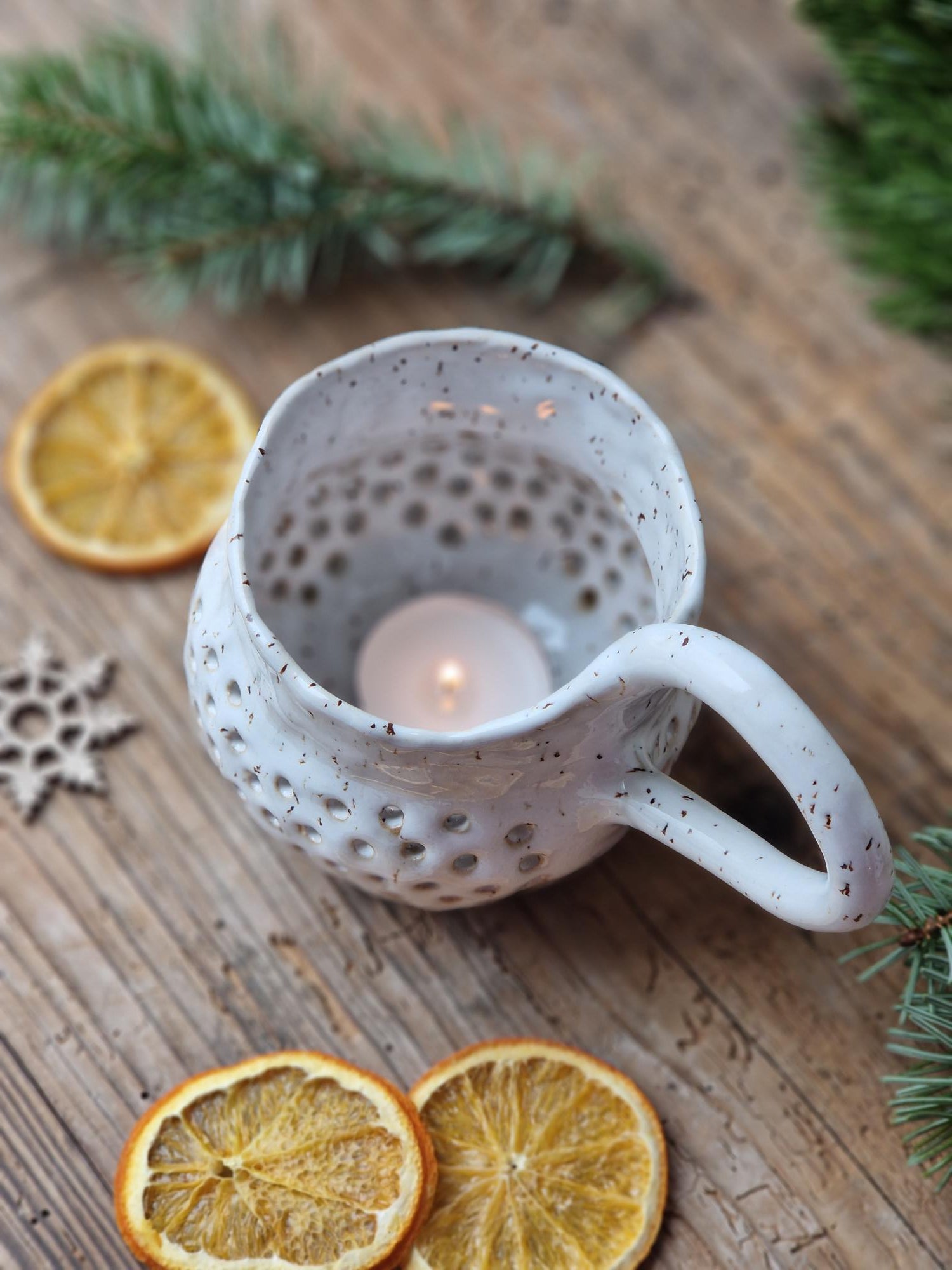 In darkness the cut-out shapes throw a beautiful pattern on nearby objects when the candle is lit and it makes for joyful and homely atmosphere.