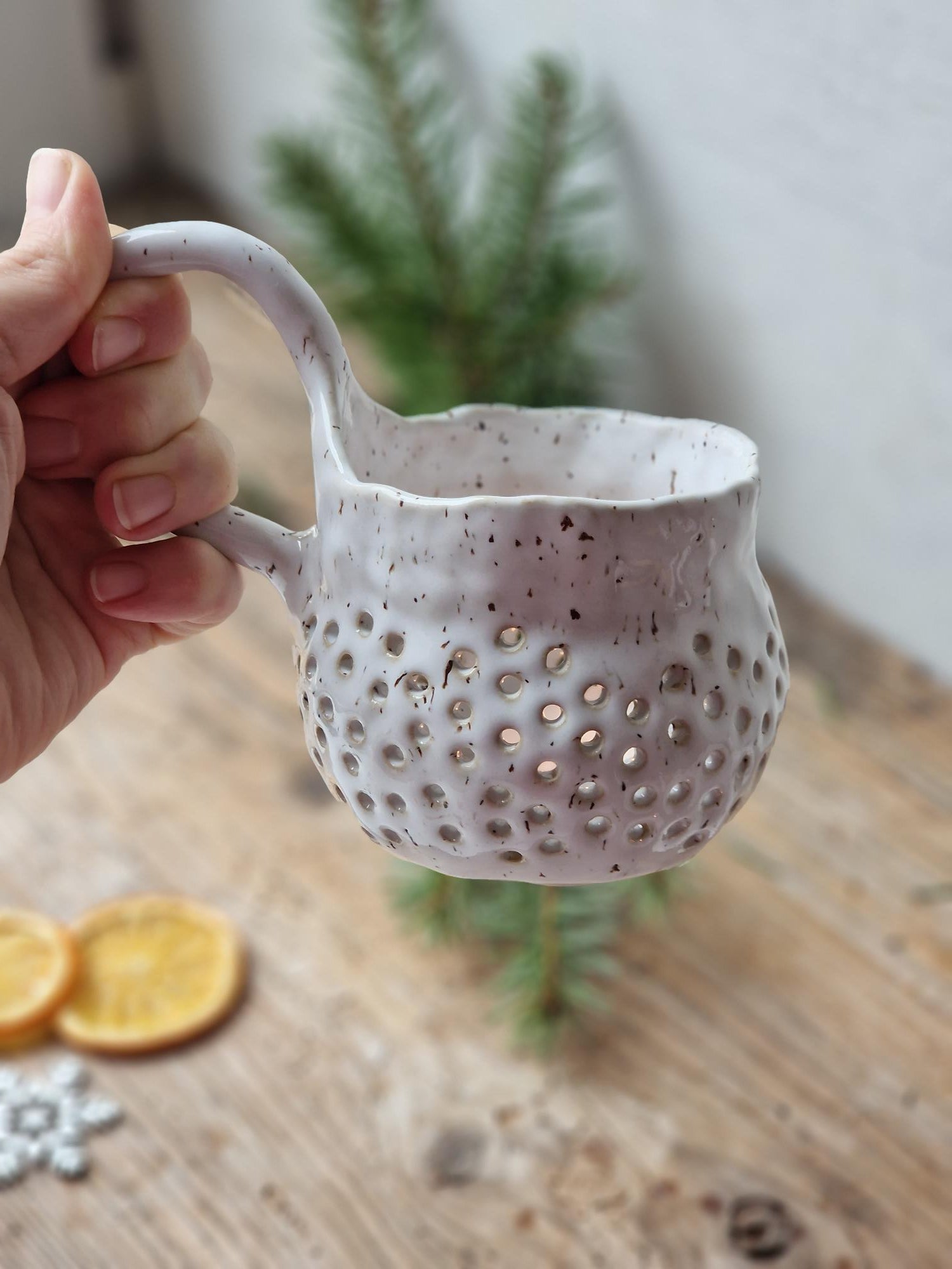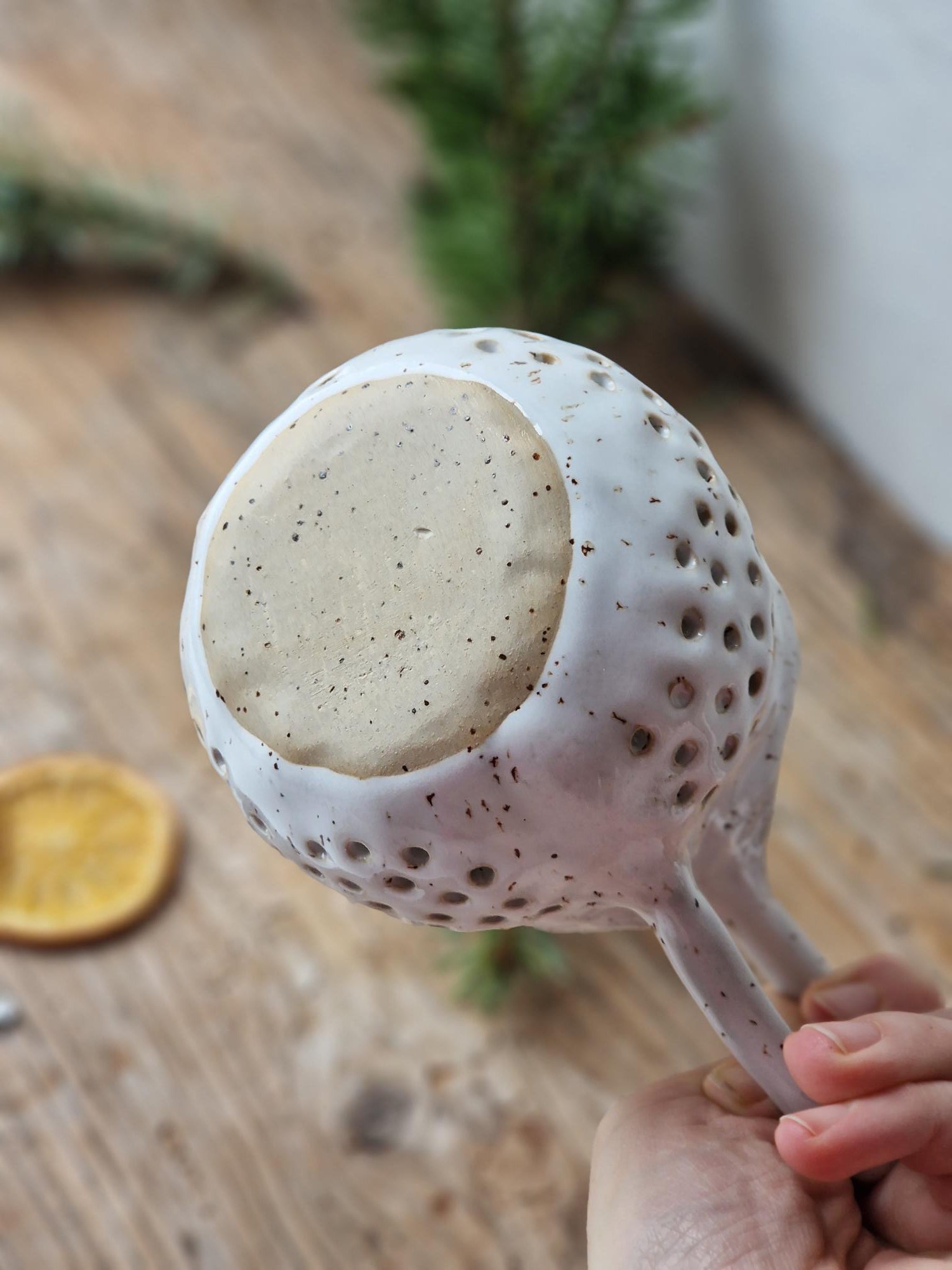 A lovely white handmade tealight holder with cut out shapes and long handle.