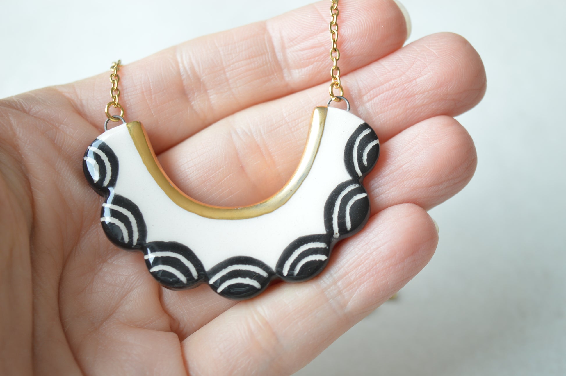 A beautiful handmade frilly ceramic necklace in black and white decorated with real gold lustre.