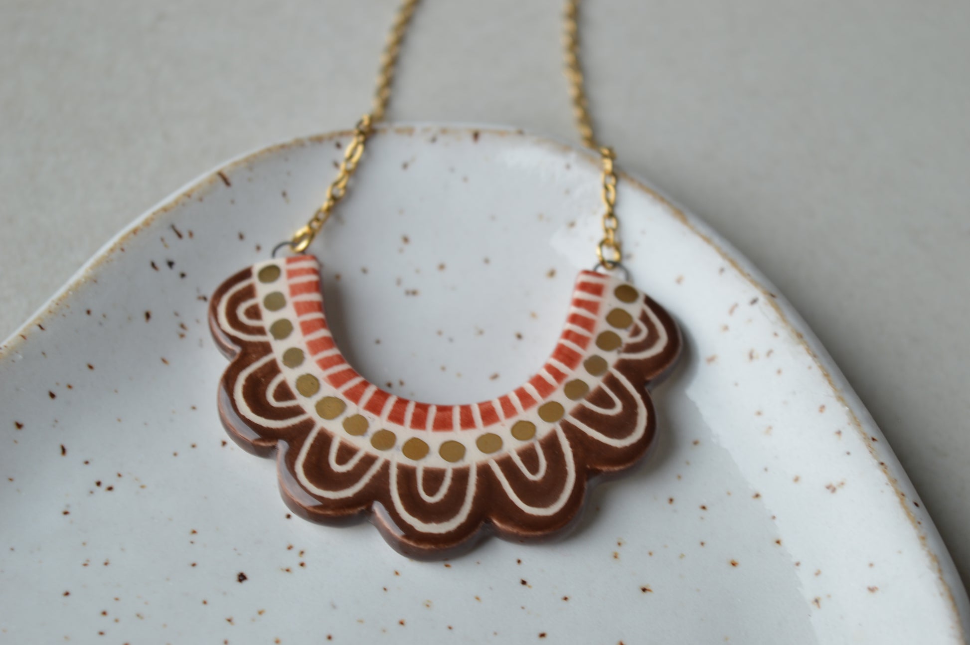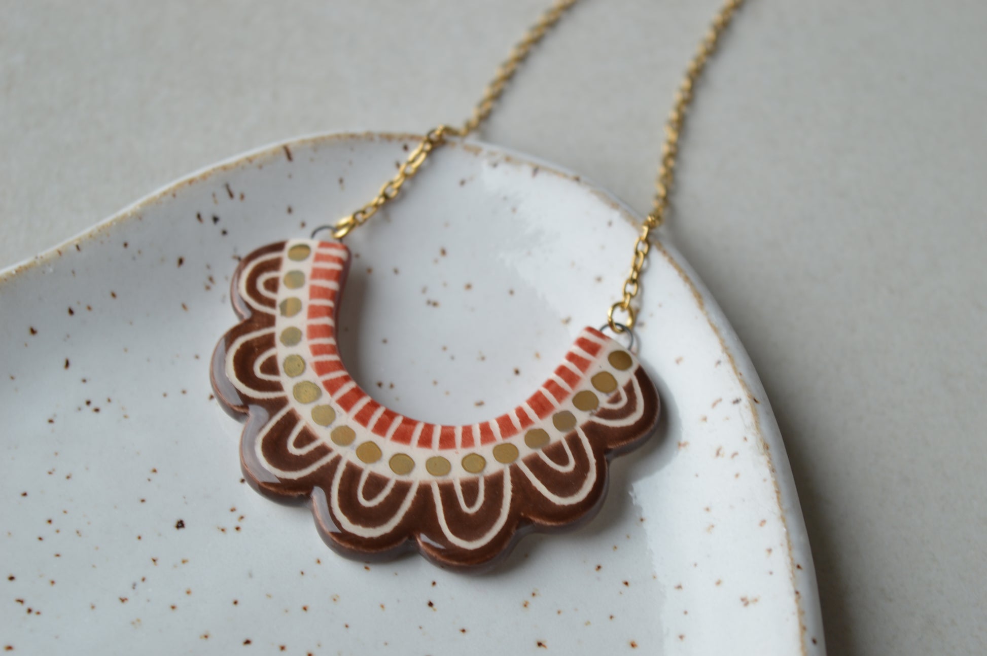 A beautiful handmade frilly ceramic necklace in dark brown and cinnamon red decorated with real gold lustre.