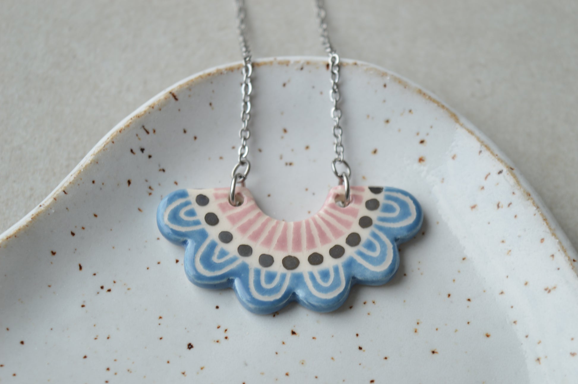 A beautiful handmade frilly ceramic necklace in blue and pink decorated with real platinum lustre.