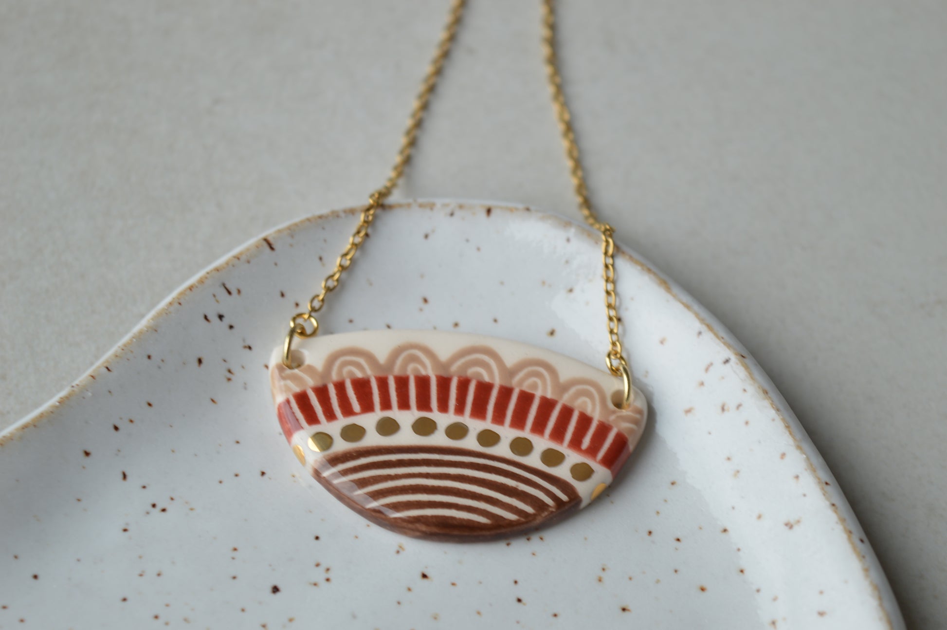 A beautiful handmade ceramic necklace in (dark) brown and cinnamon red decorated with real gold lustre.