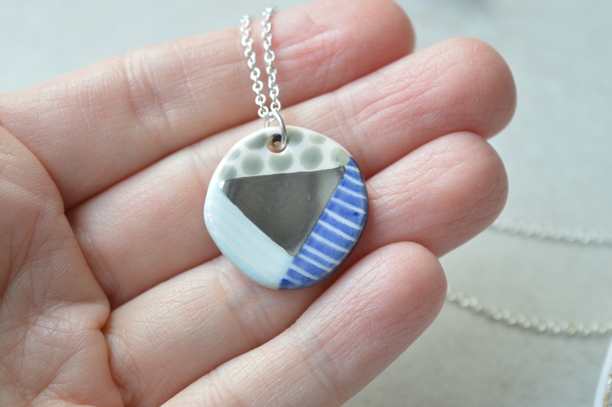 This beautiful ceramic necklace was made of white earthenware clay, decorated with sgraffito technique and platinum lustre. The pendant is light and comfortable to wear. Glazed on both sides, the back being just white.