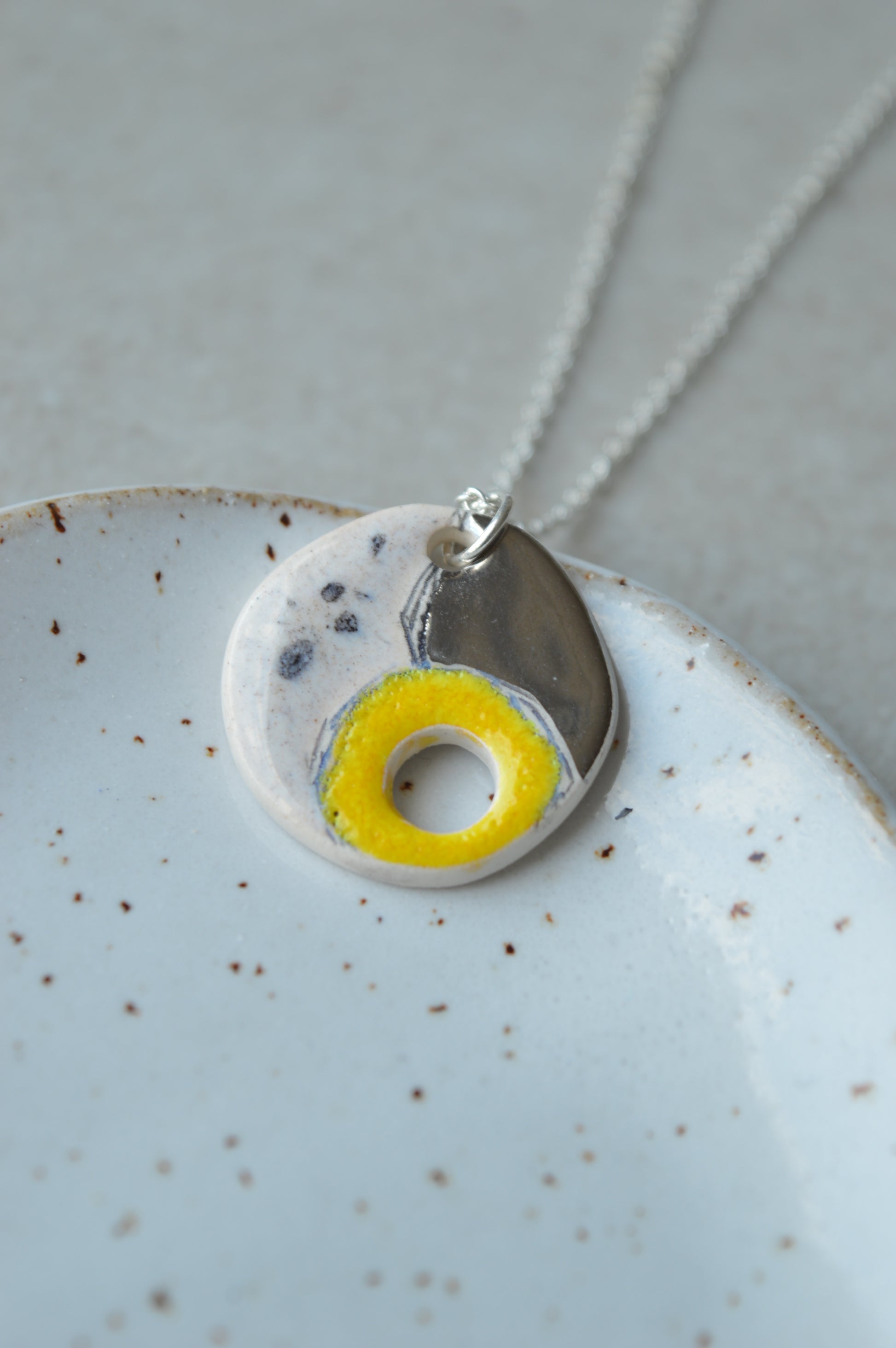 This beautiful ceramic necklace was made of white earthenware clay, carved with geometric pattern, and decorated with platinum lustre. The pendant is light and comfortable to wear. Glazed on both sides, the back being just white.