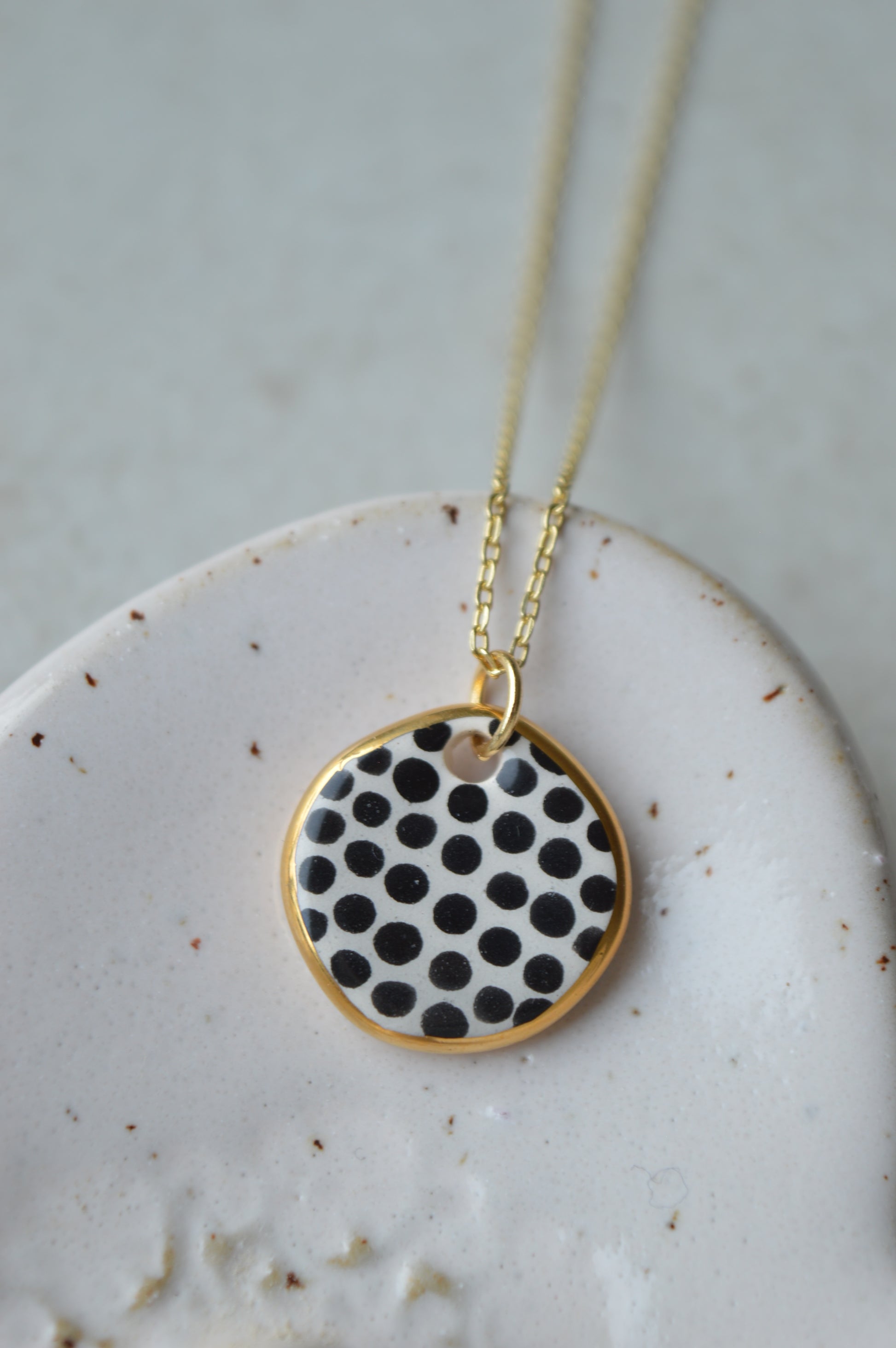 This beautiful ceramic necklace was made of white earthenware clay, glazed with black polka dot, and gold lustre. The pendant is light and comfortable to wear. Glazed on both sides.