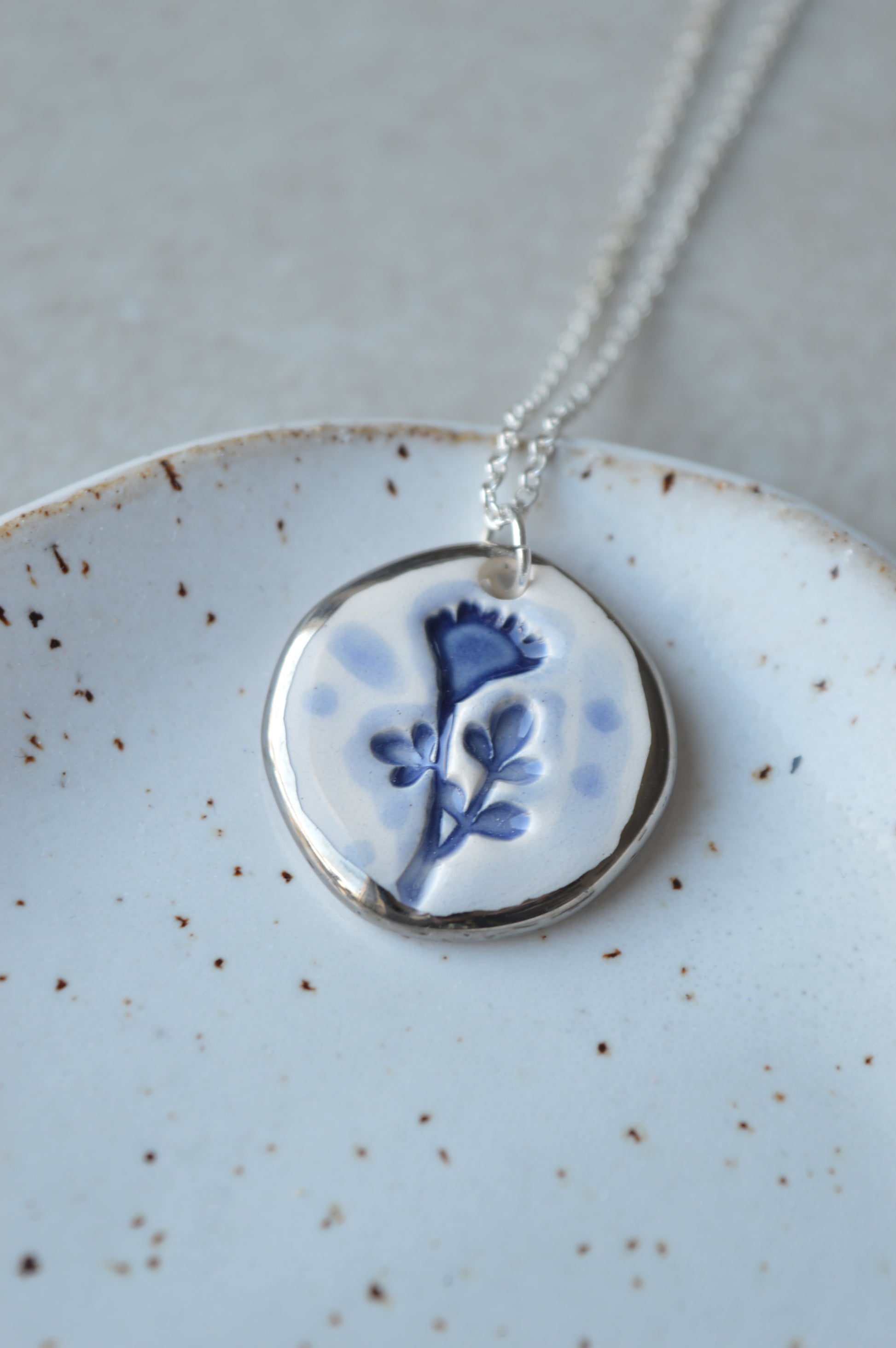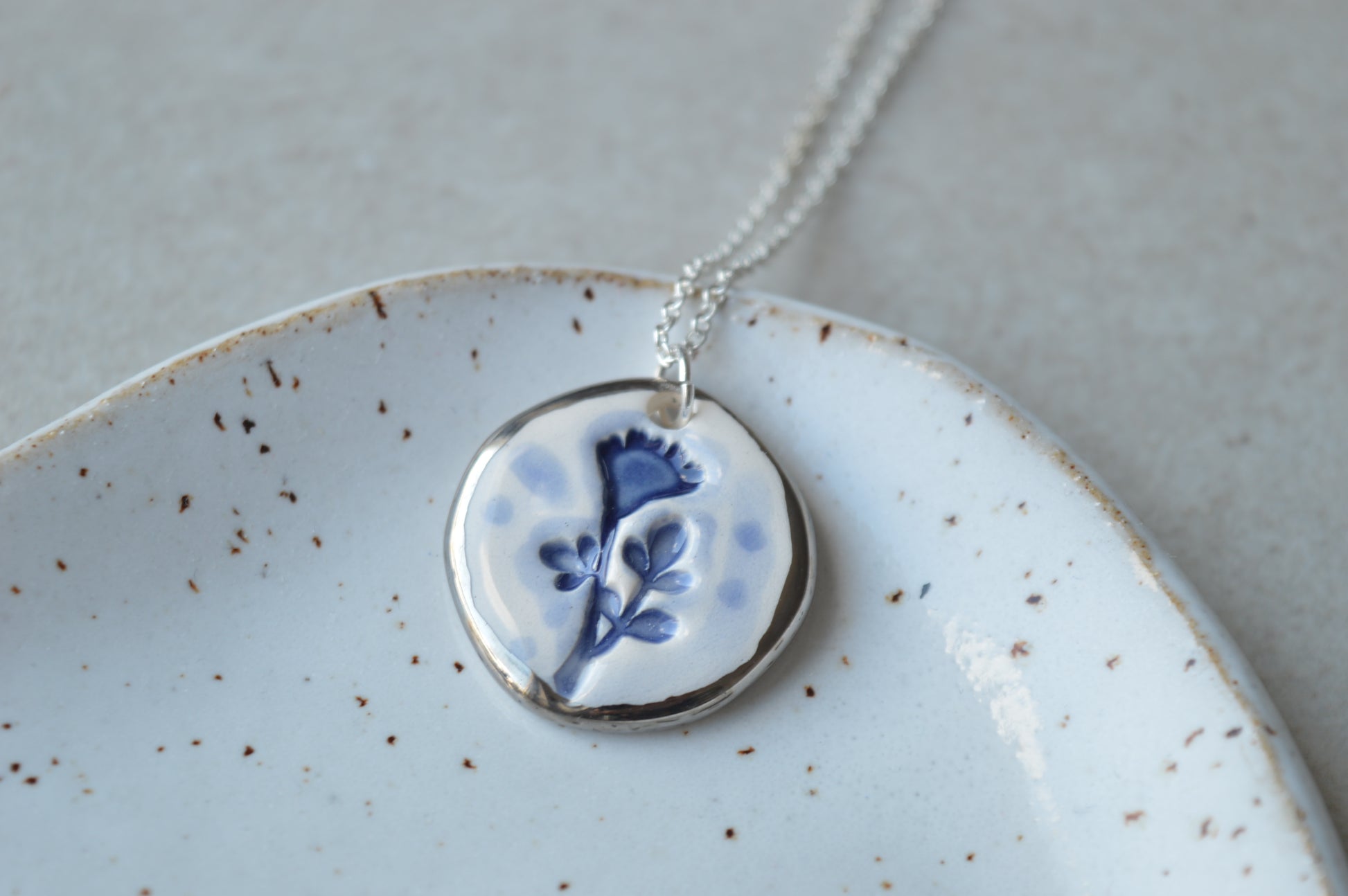 This beautiful floral ceramic necklace was made of white earthenware clay, handpainted in watercolour technique, and embellished with platinum lustre. The pendant is light and comfortable to wear. Glazed on both sides, the back being just white.