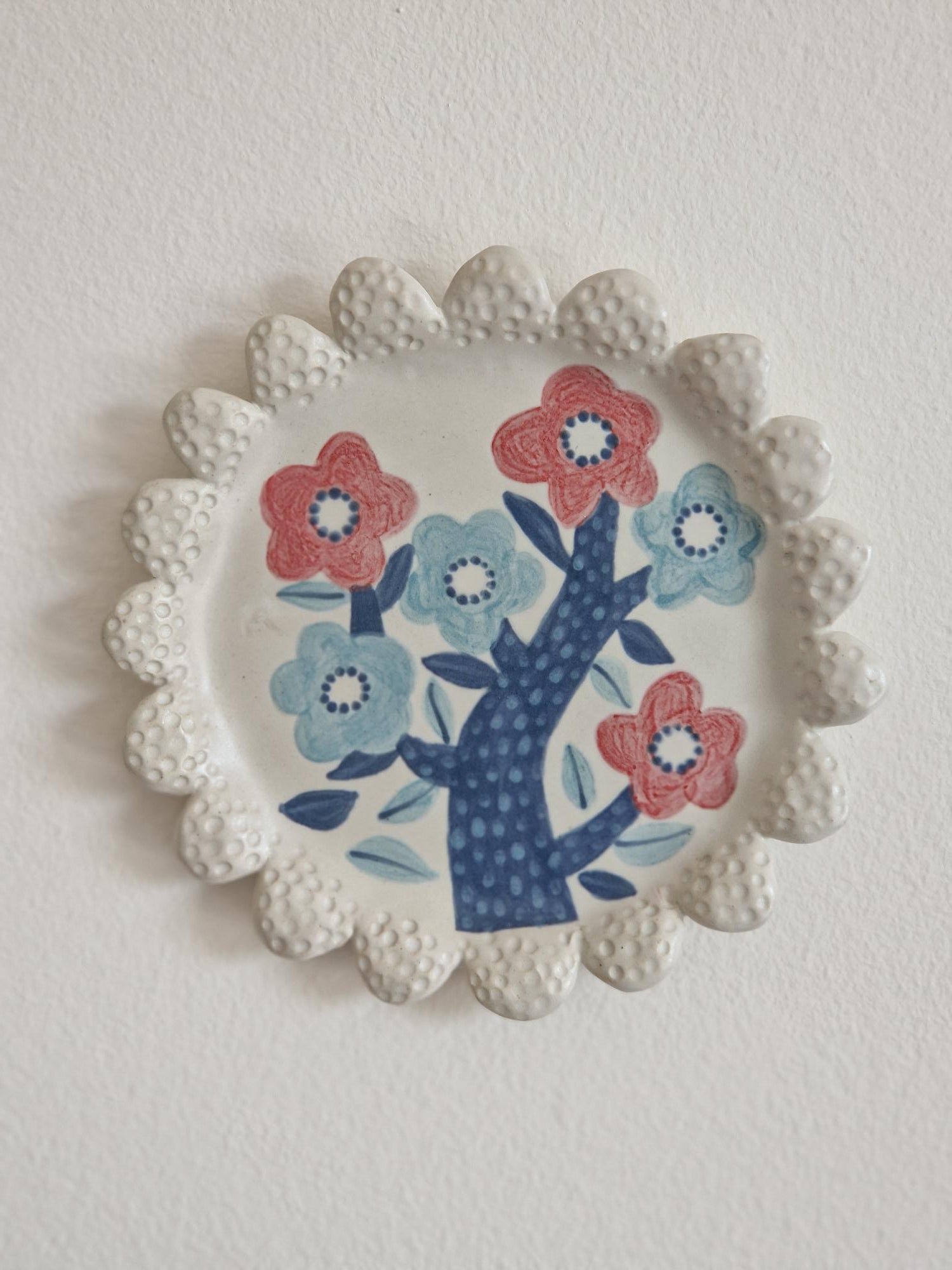 A lovingly handmade scalloped ceramic plate that can be hung on the wall or used as an appetiser plate.