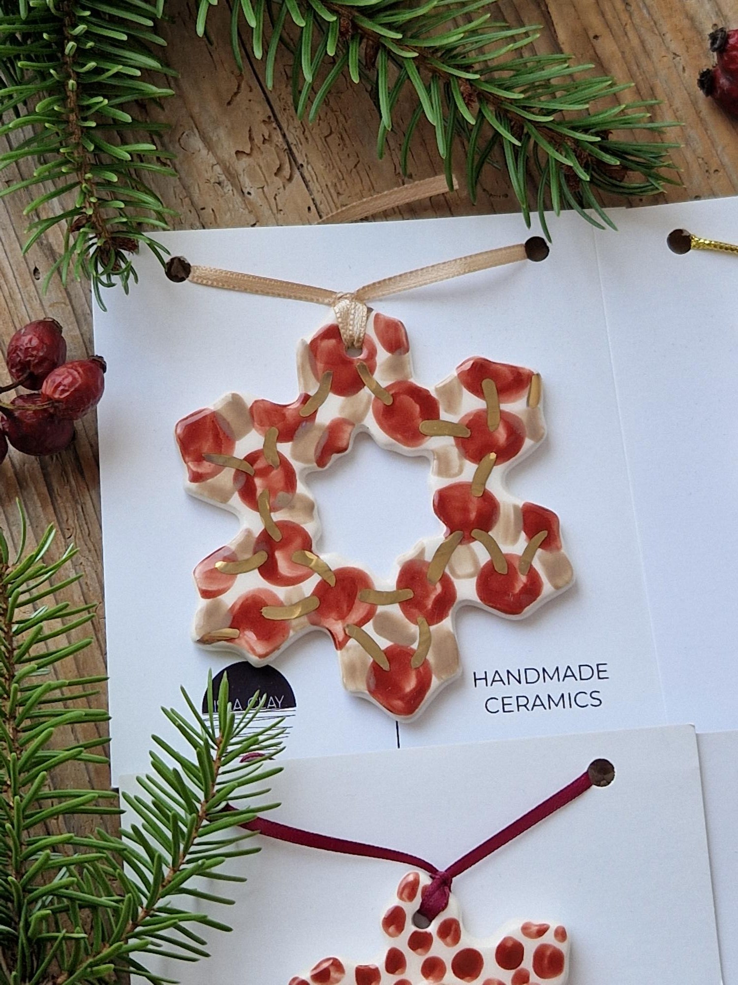 This listing is for a SET of 4 handmade ceramic snowflake ornaments. Made of white earthenware clay, handpainted with red underglaze, glazed with glossy transparent glaze, and decorated with gold lustre. The ornaments come with ribbons/cords attached.