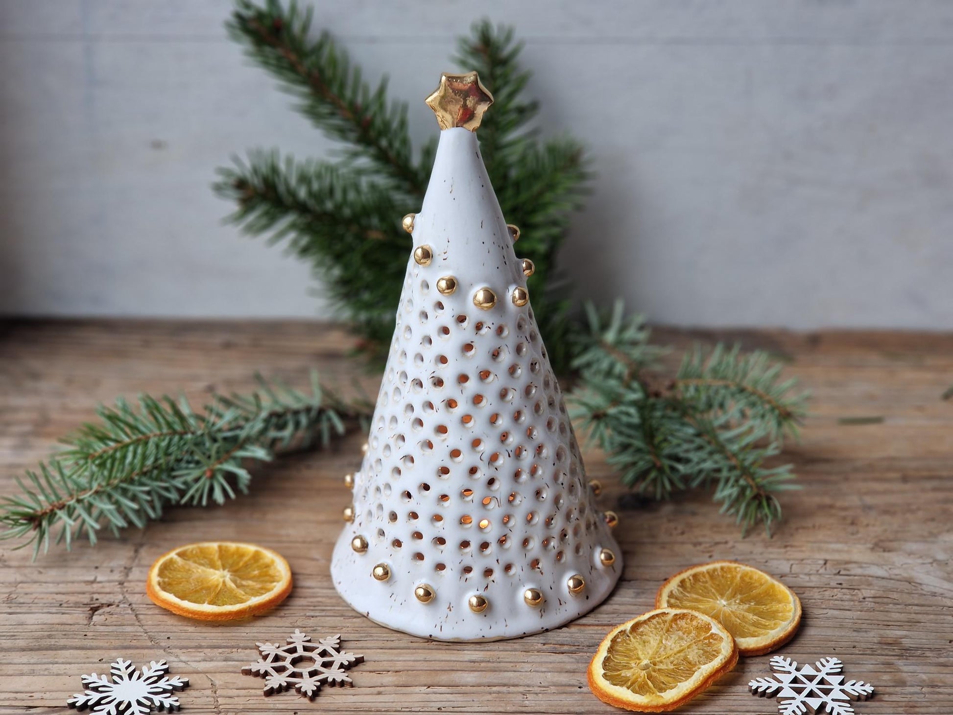 This handmade ceramic Christmas tree candle holder with gold pearls is going to make your room feel very festive!