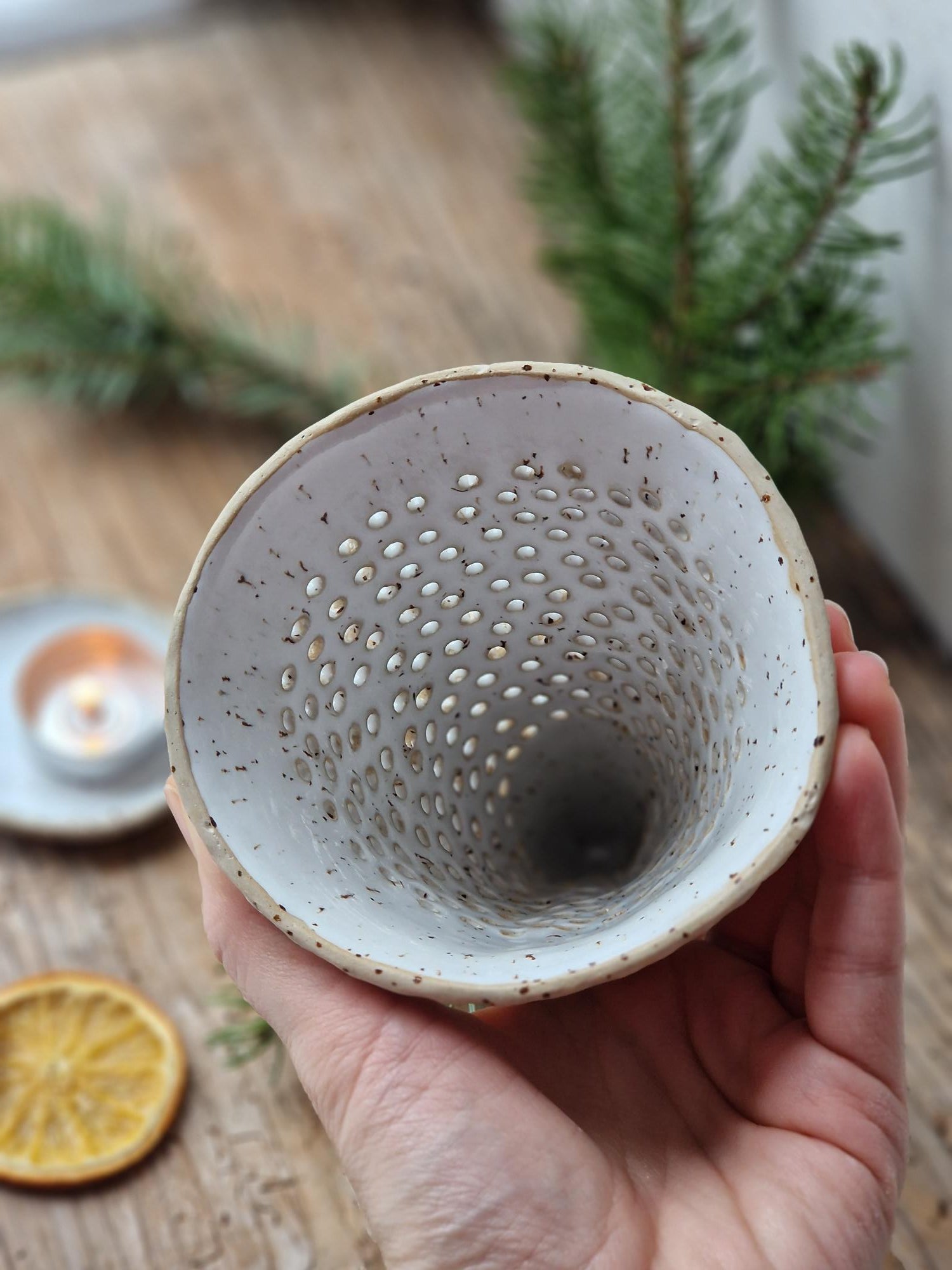 In darkness the cut-out circles throw a beautiful pattern on nearby objects when the candle is lit and it makes for joyful and homely atmosphere.