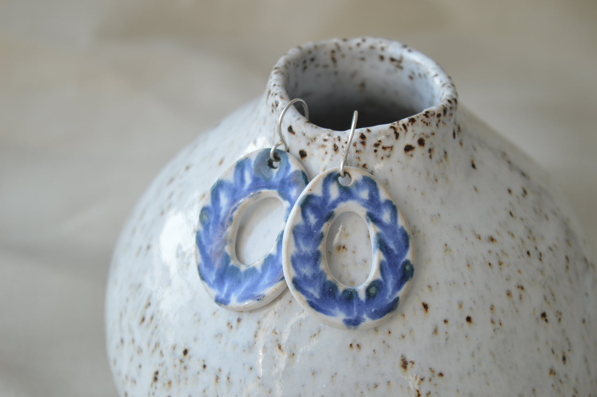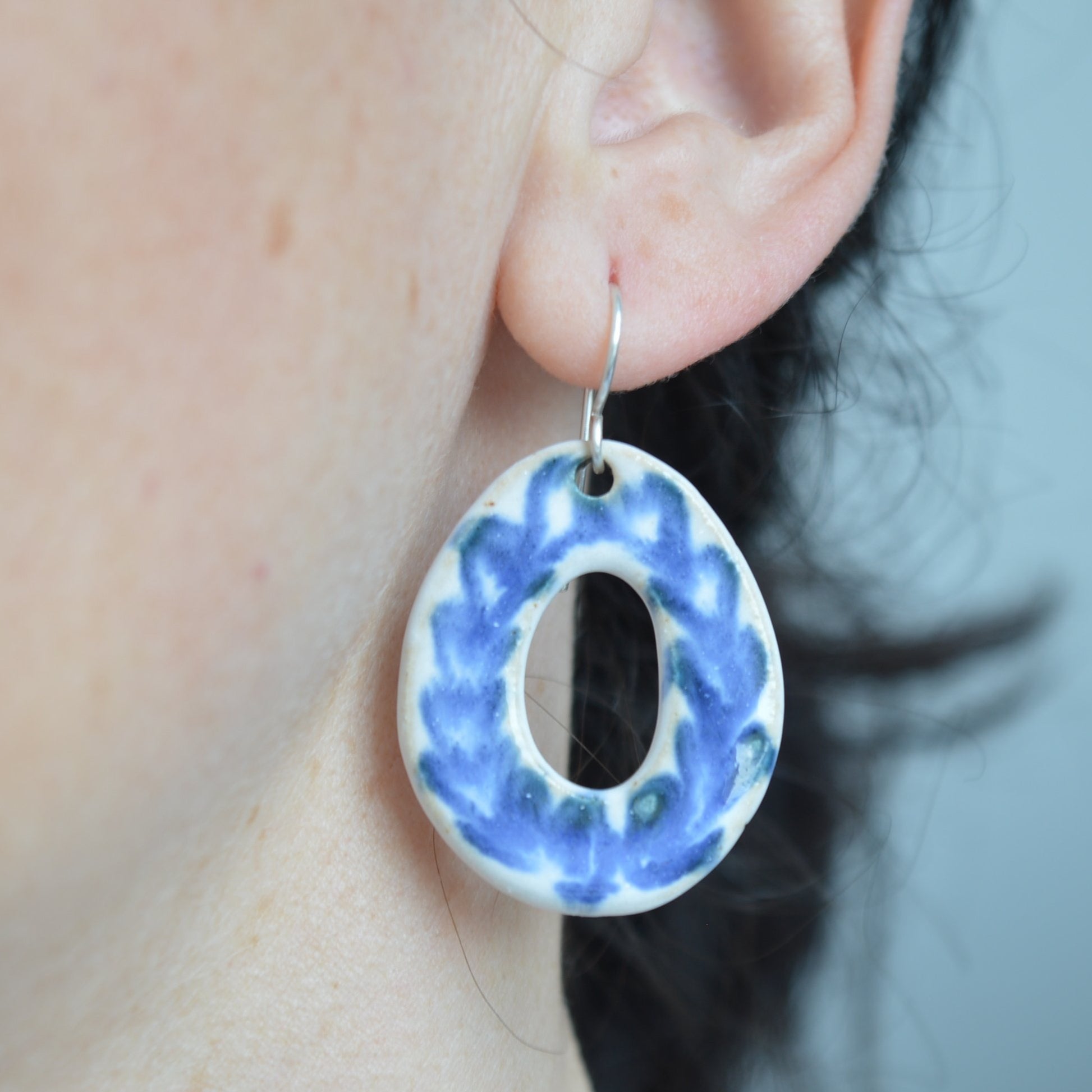 A pair of lovingly handmade ceramic statement earrings in glossy white with handpainted blue pattern.