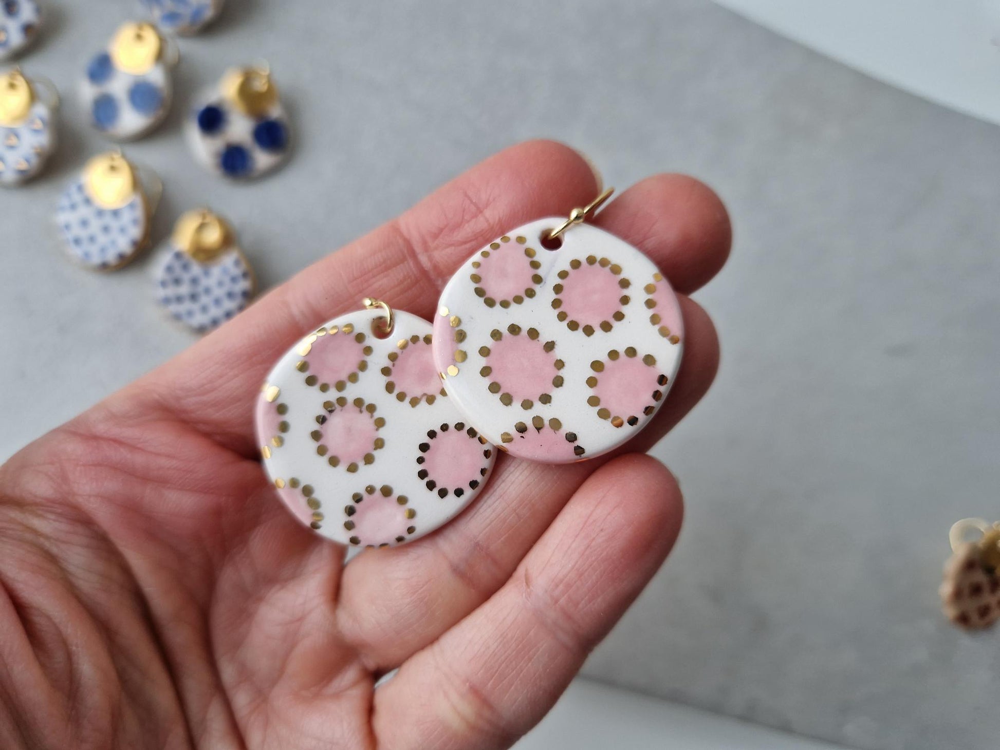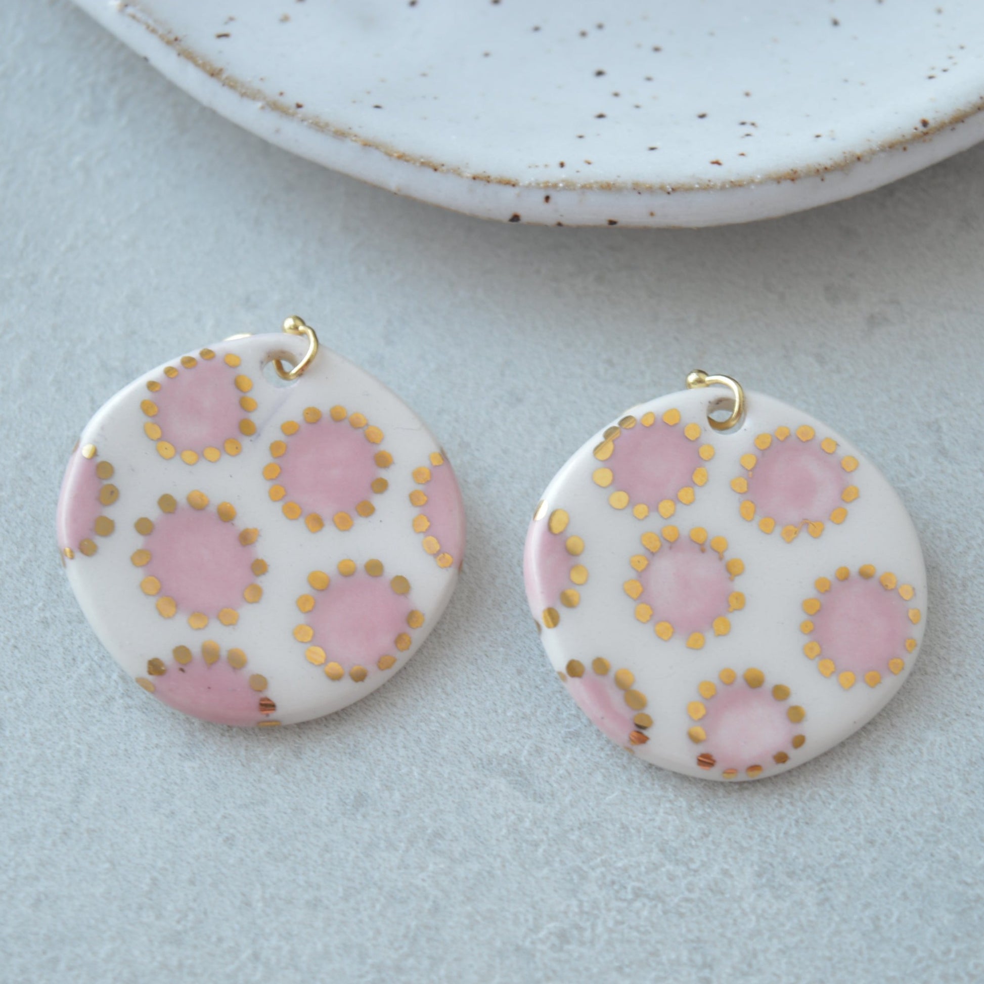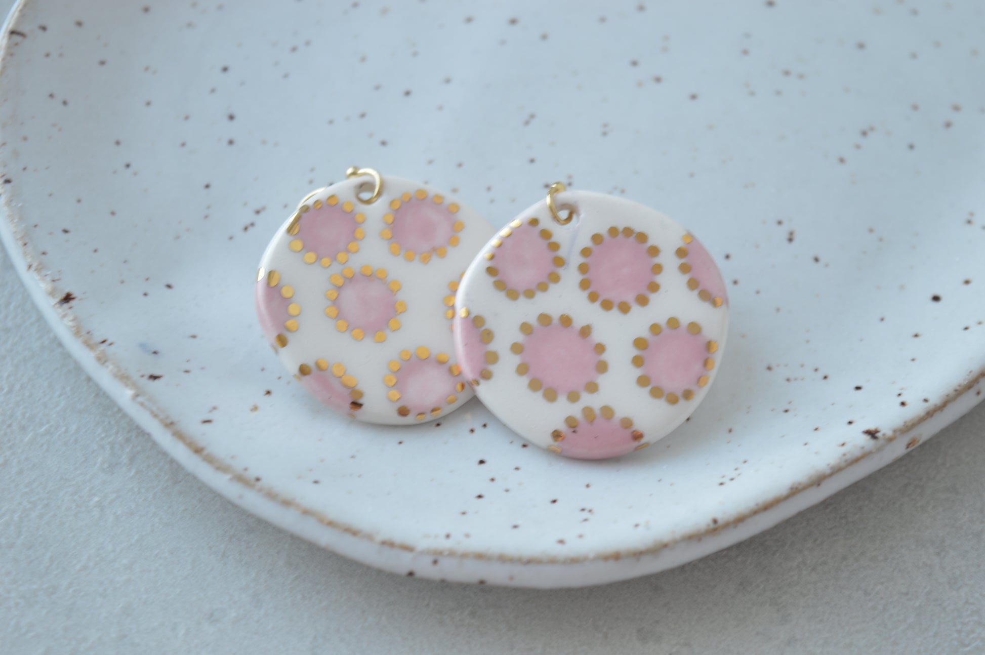 A pair of handmade ceramic drop earrings with gold lustre. Modern organic shape. Comfortable and lightweight to wear.