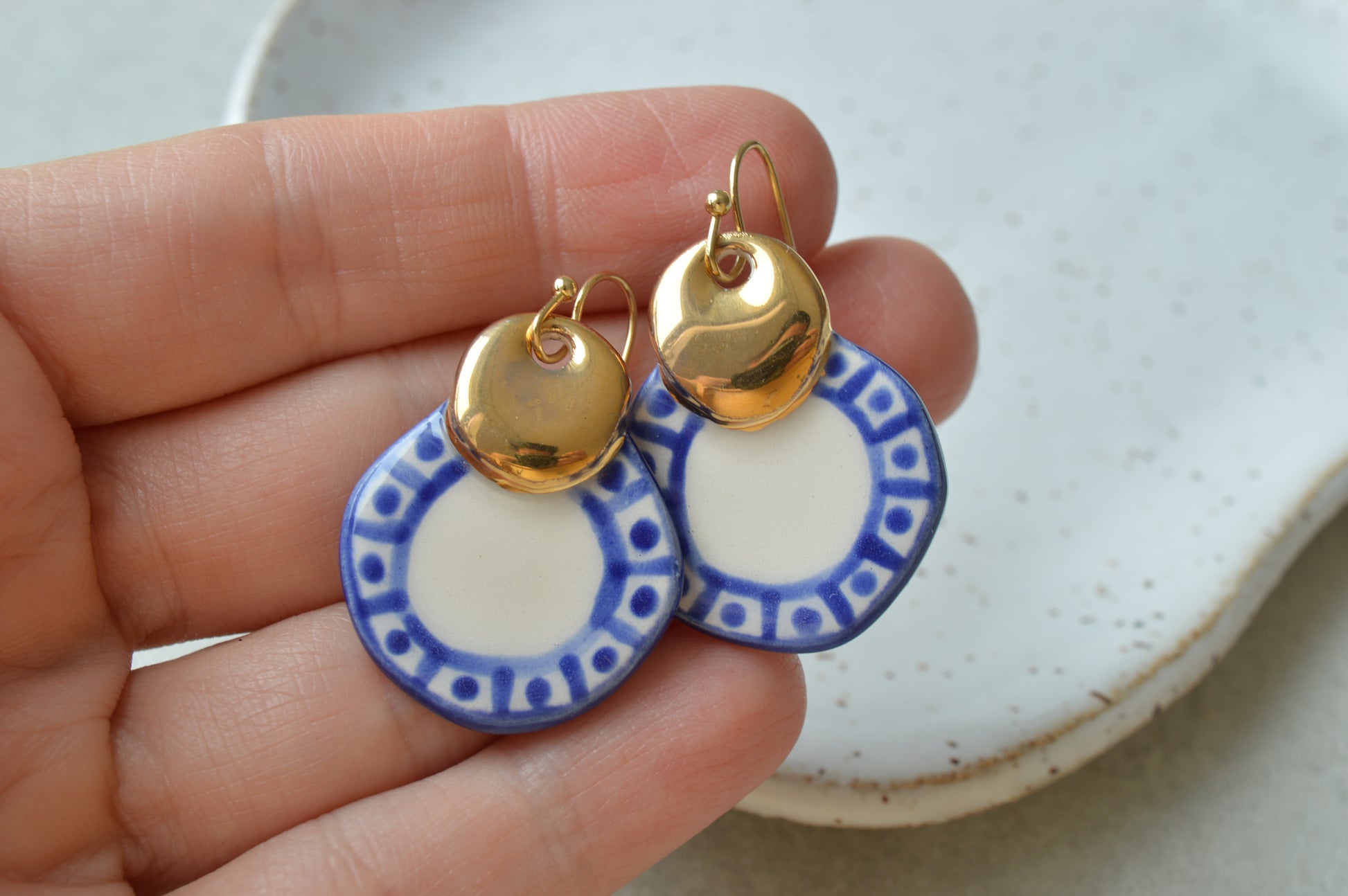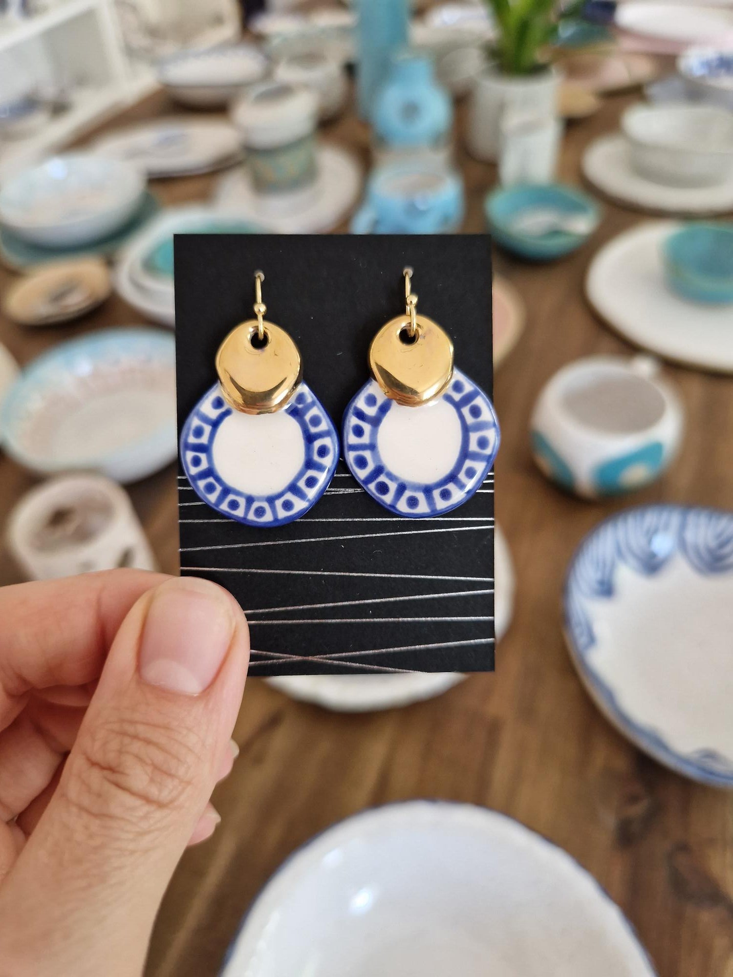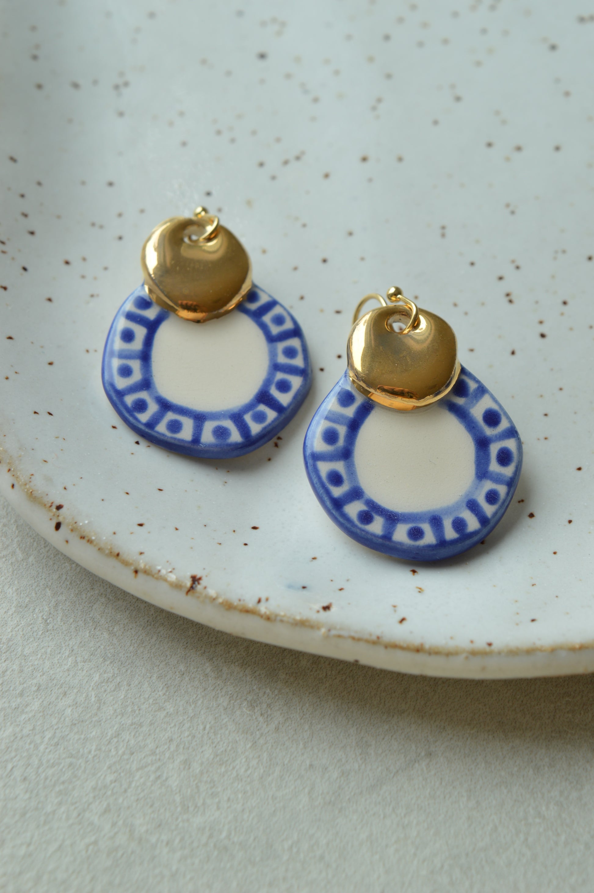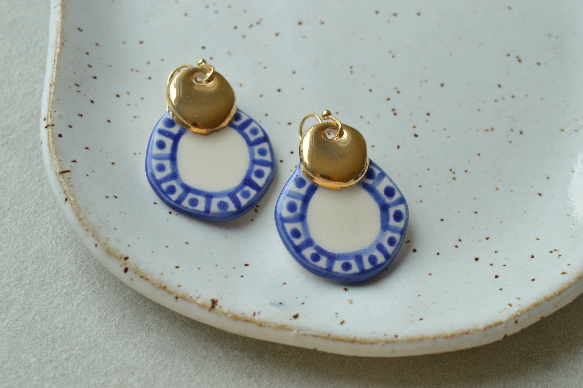 A pair of handmade ceramic drop earrings in royal blue and white with gold lustre. Modern organic shape. Comfortable and lightweight to wear.