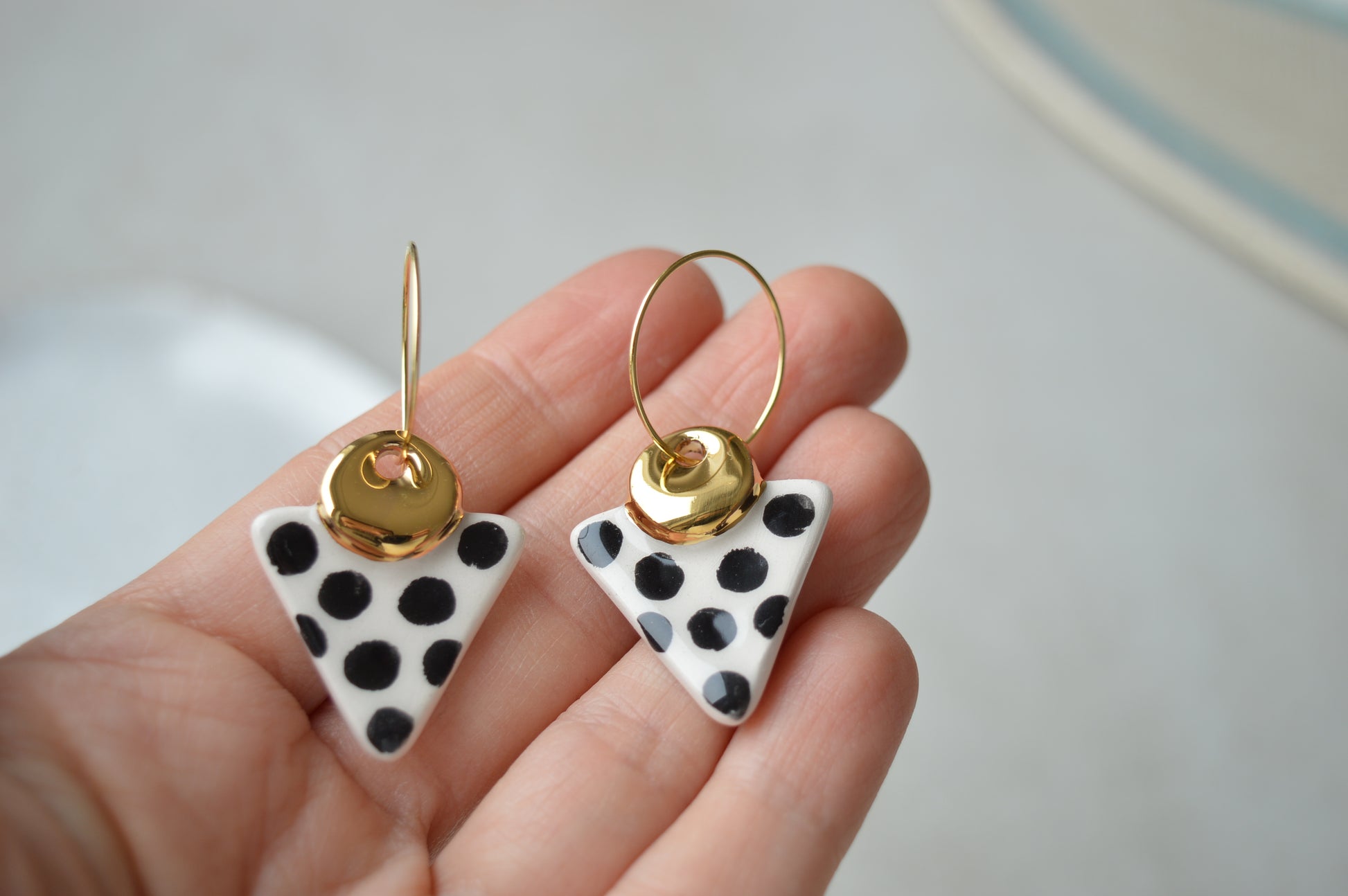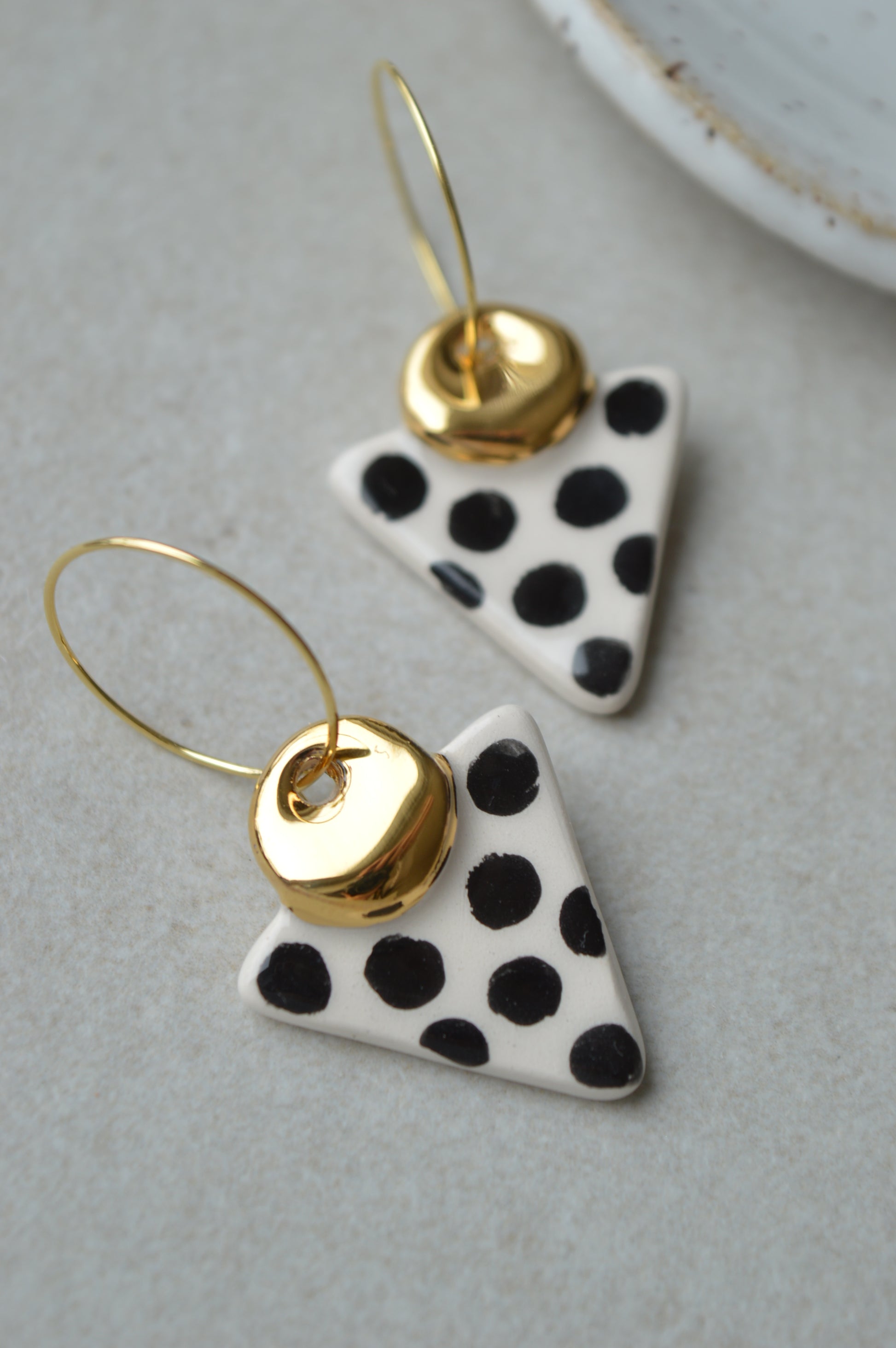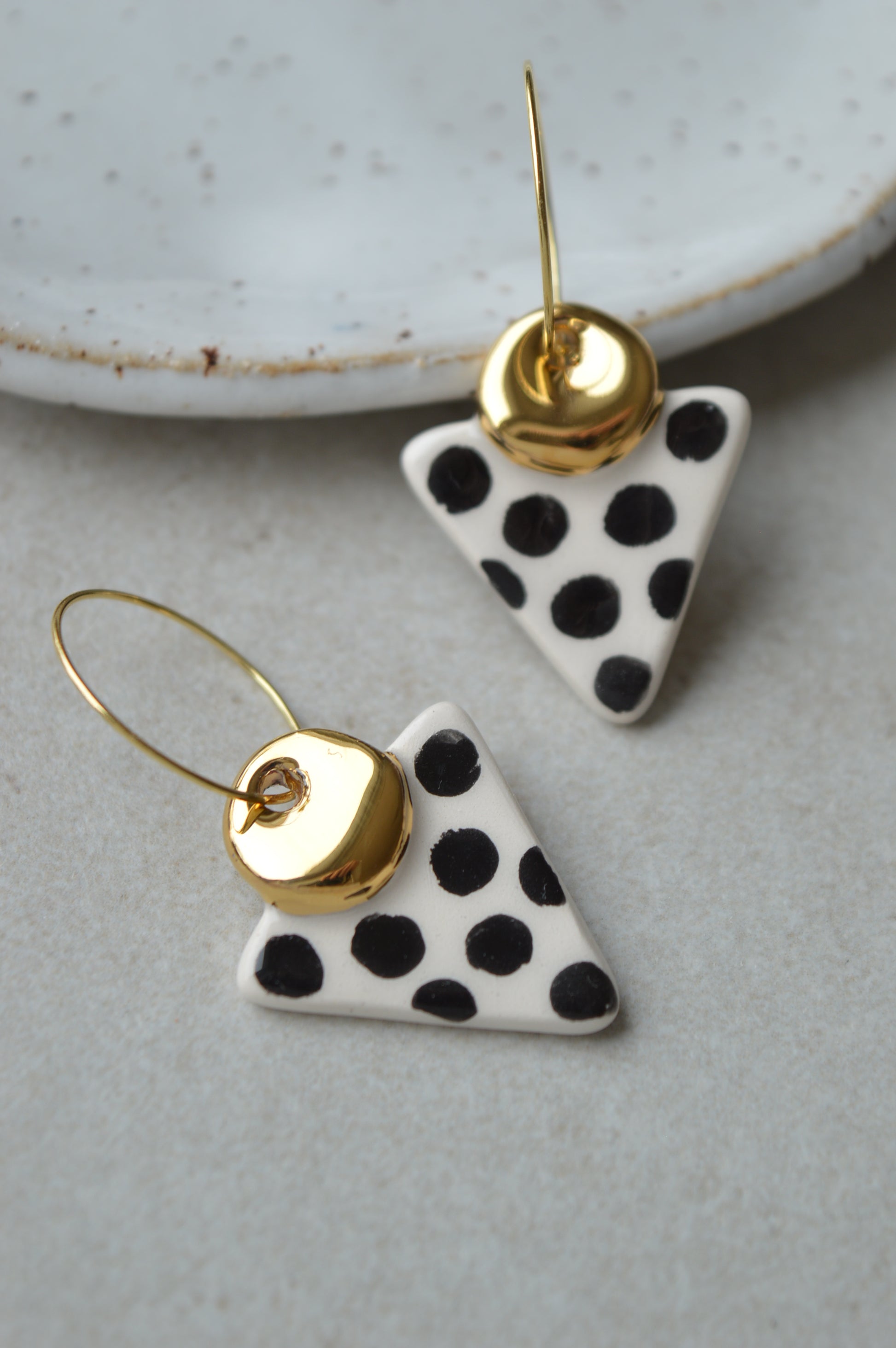 A pair of handmade ceramic drop earrings in black and white with gold lustre. Modern organic shape. Comfortable and lightweight to wear.