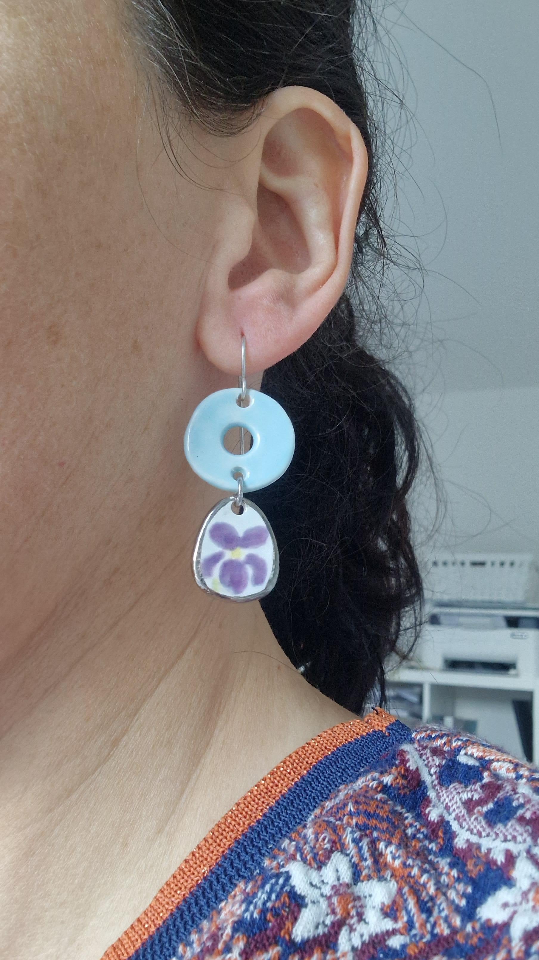 A pair of long ceramic dangle earrings in light blue and handpainted violets. Comfortable and lightweight to wear.