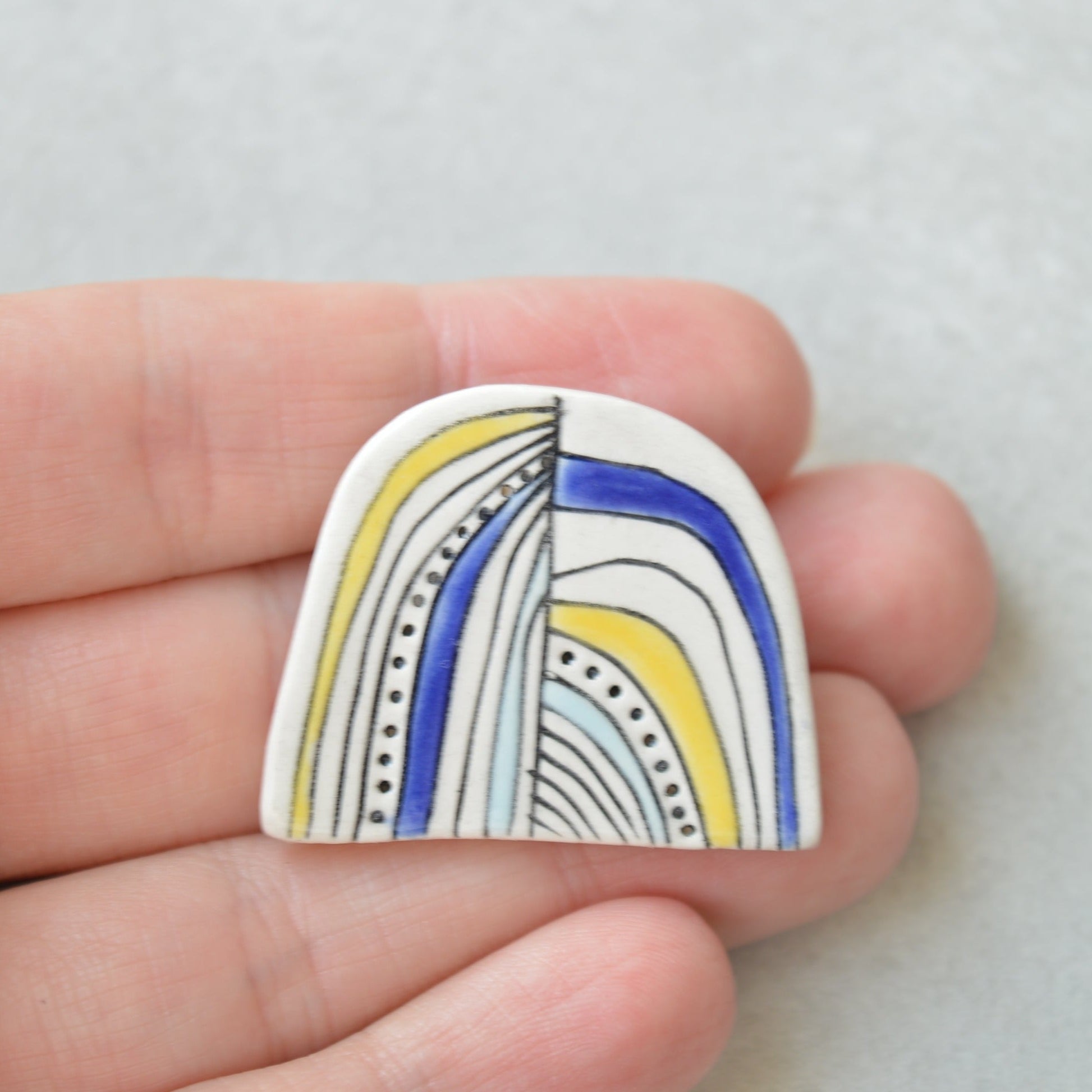 A handmade ceramic brooch with carved black geometric pattern. and blue and yellow details.