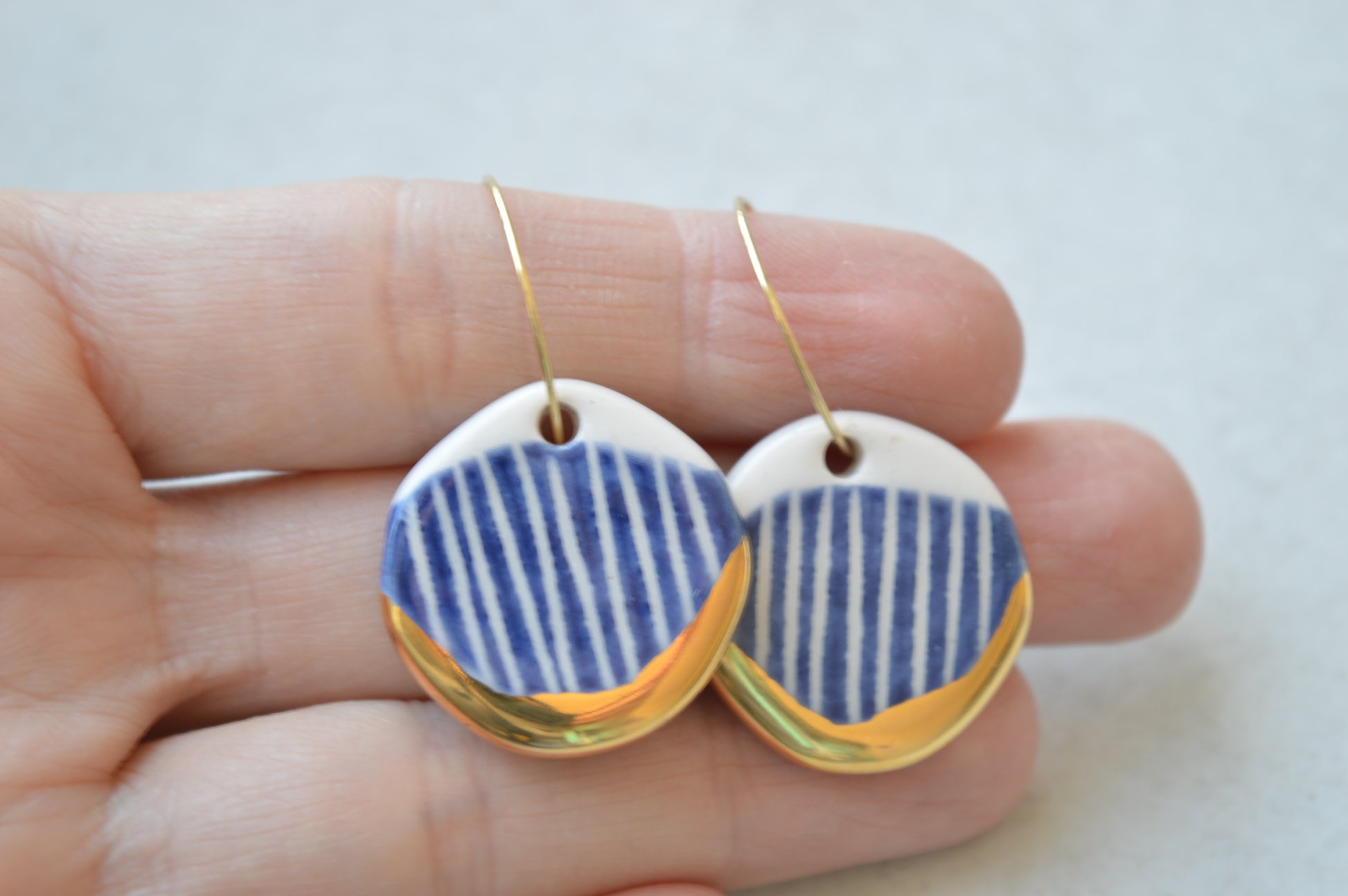 A pair of elegant ceramic drop earrings in navy blue and gold. Modern organic shape. Comfortable and lightweight to wear.
