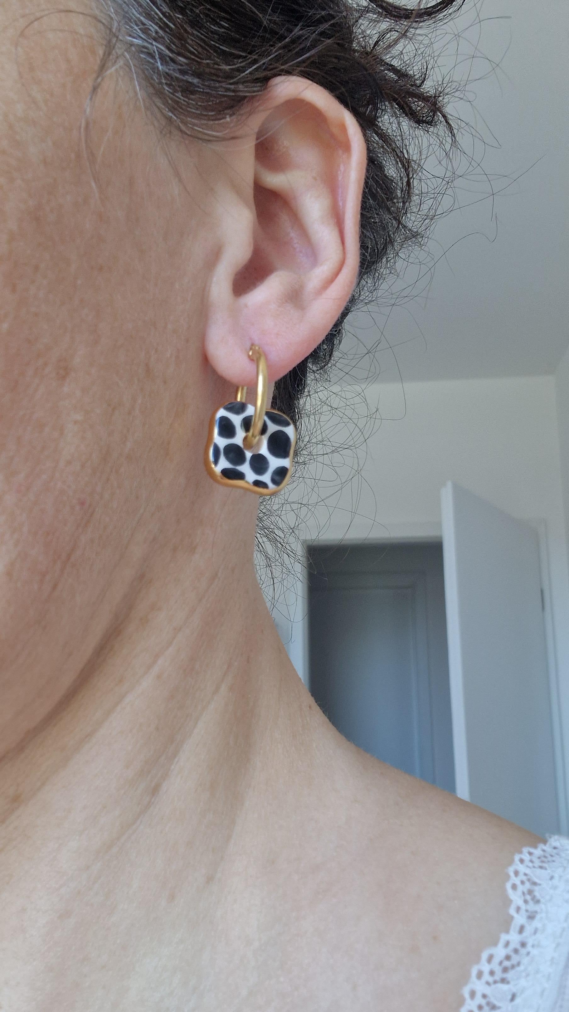 A pair of elegant handmade ceramic hoops painted with black dots and embellished with gold. Comfortable and lightweight to wear.