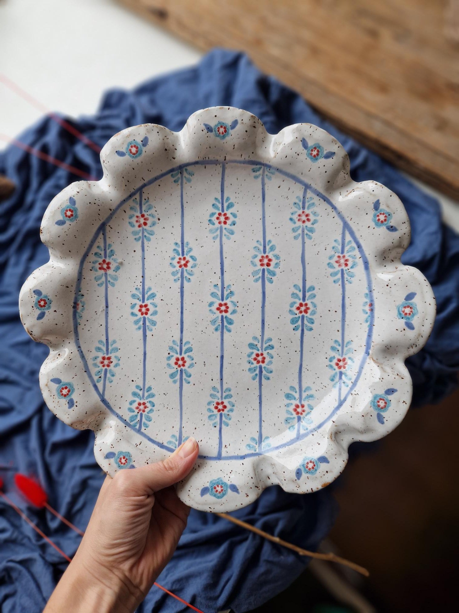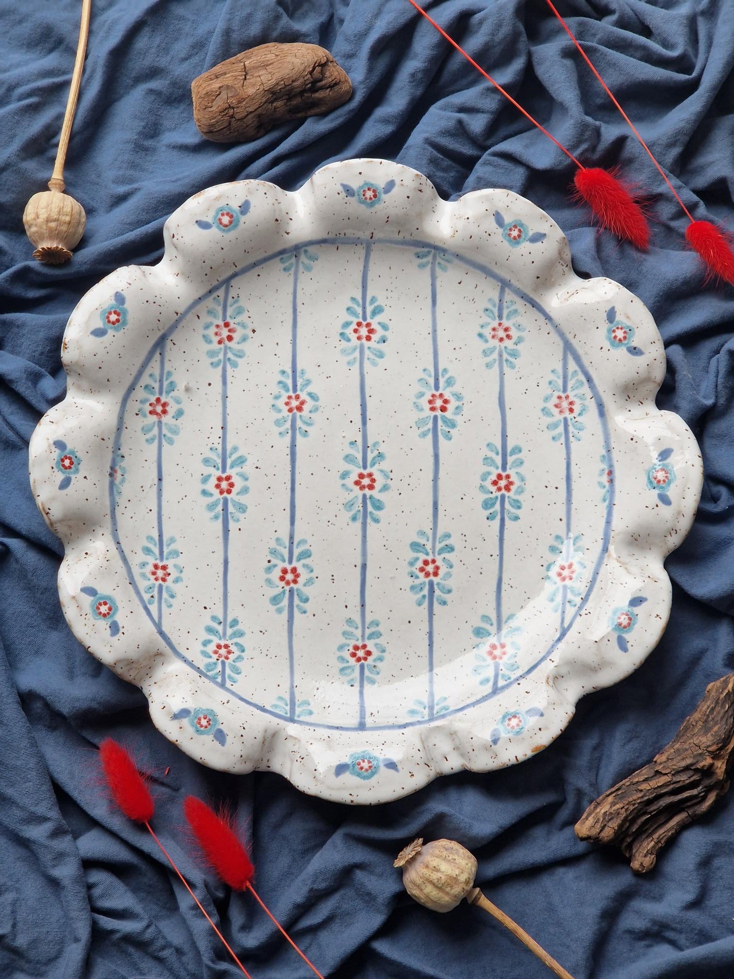 Lovingly handmade large ceramic platter / serving bowl with wavy rim and beautiful handpainted floral pattern.