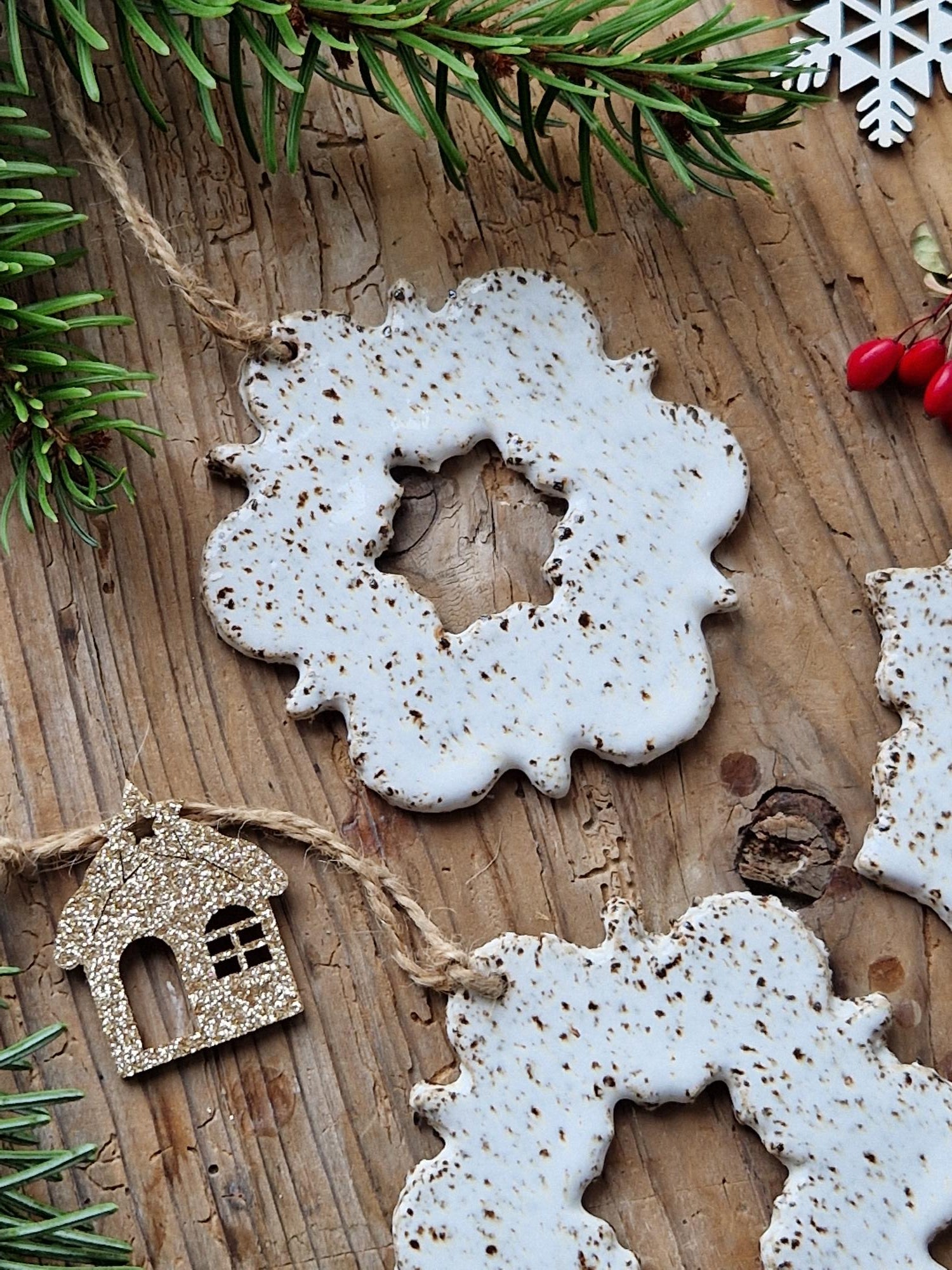 This listing is for a SET of 3 handmade ceramic snowflake ornaments. Made of speckled white stoneware clay, and glazed with glossy white glaze on both sides. The ornaments come with ribbons/cords attached.