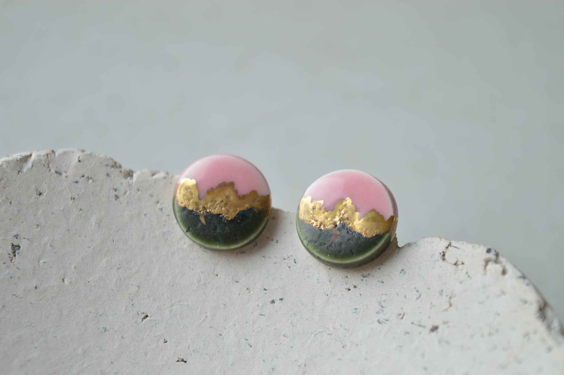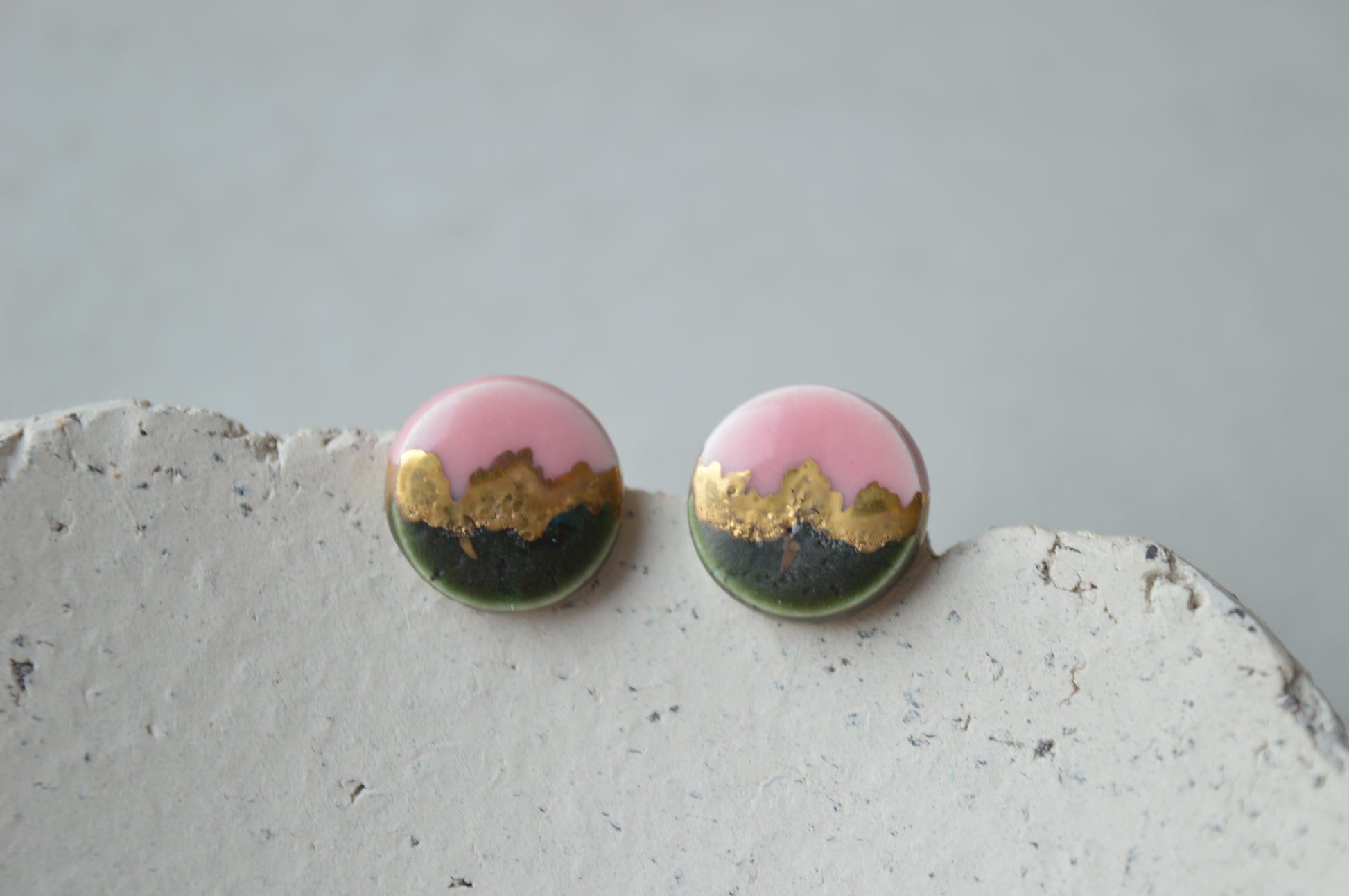 A pair of handmade round ceramic stud earrings in matte green, speckled white and pink.